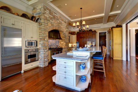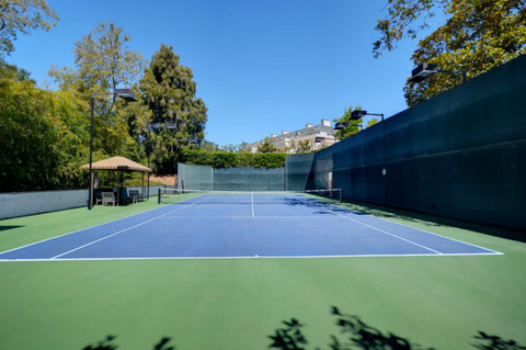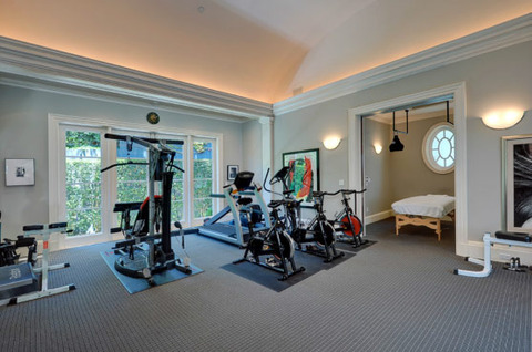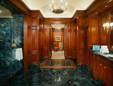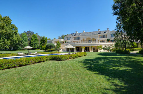 According to the listing with The Agency, the mansion, which was built in 2001 and has three levels and includes eight bedrooms, 17 bathrooms, four acres of land, a wine cellar, pool house, tennis court, putting green, custom movie room, library, three bars, gym, two safe rooms, separate quarters for help and special event staff that includes two beds and a living room accessible through a service entrance in the garage, a Gavin de Becker security systems with Crestron monitors throughout the house, a two-story oval foyer with crown molding and verde jade marble flooring, children’s suites, main rooms with 12’ high ceilings and three inch-thick mahogany doors, living room with 15’ ceilings, and more.