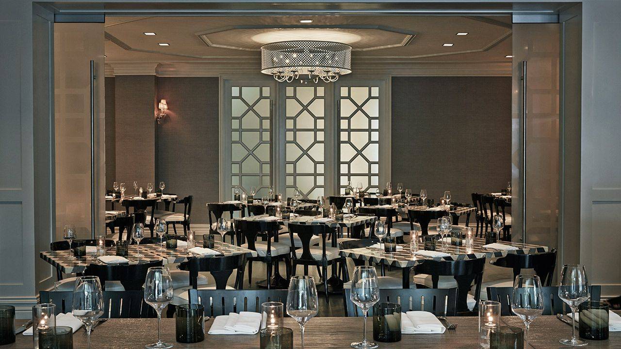 The new private dining room can seat between 40 and 50 guests. The main dining room, which flows to the outside dining area and pool, features a new communal table and two booths. All the walls feature a textured, neutral covering; there is also damask wallpaper near the kitchen entrance.