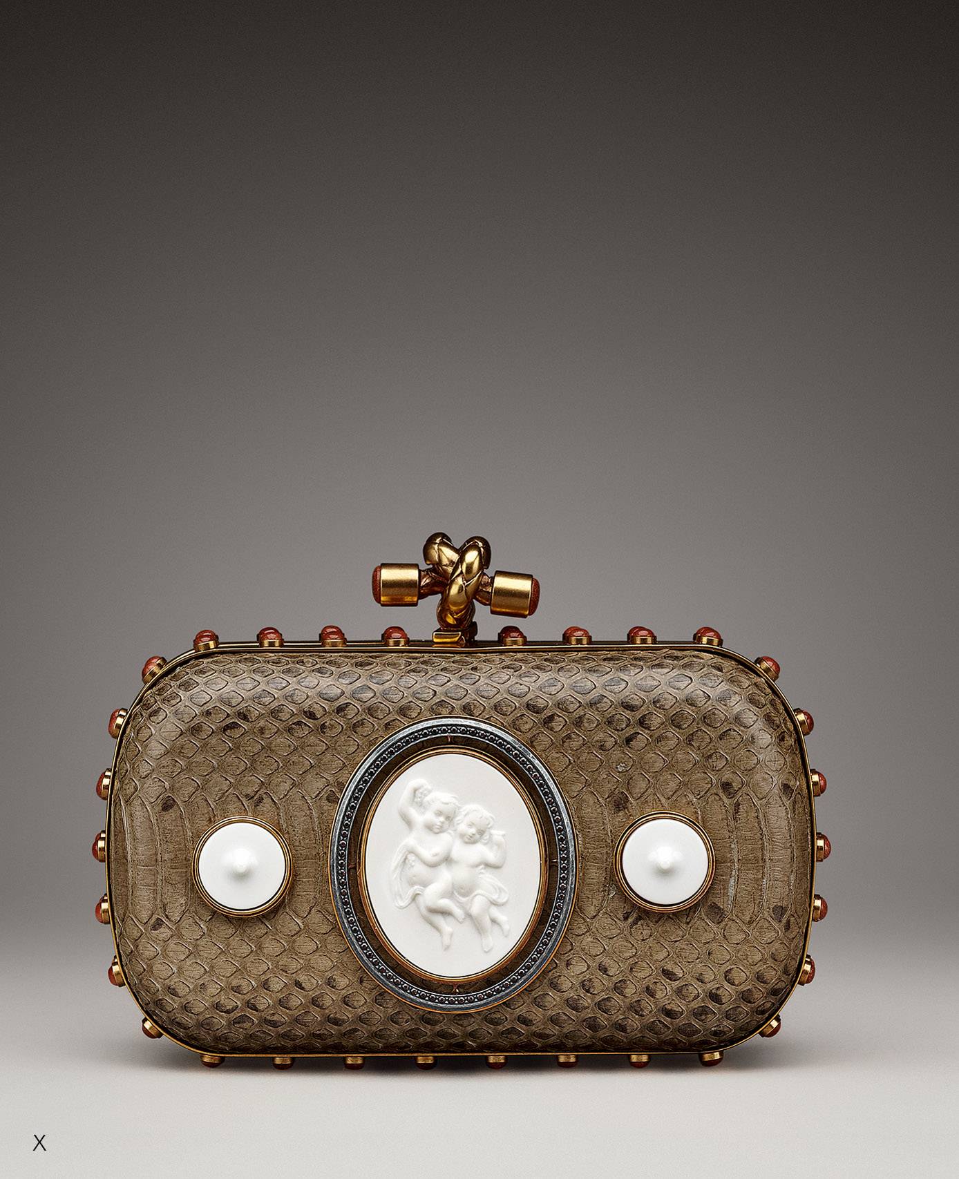 This version of the bag was created from a combination of exotic and classical accents. The front side is embellished with a unique porcelain medallion featuring hand carved angels that have been produced exclusively for Bottega Veneta. They are set in Oro Bruciato and surrounded by a delicate contrasting trim of brown cubic zirconia.