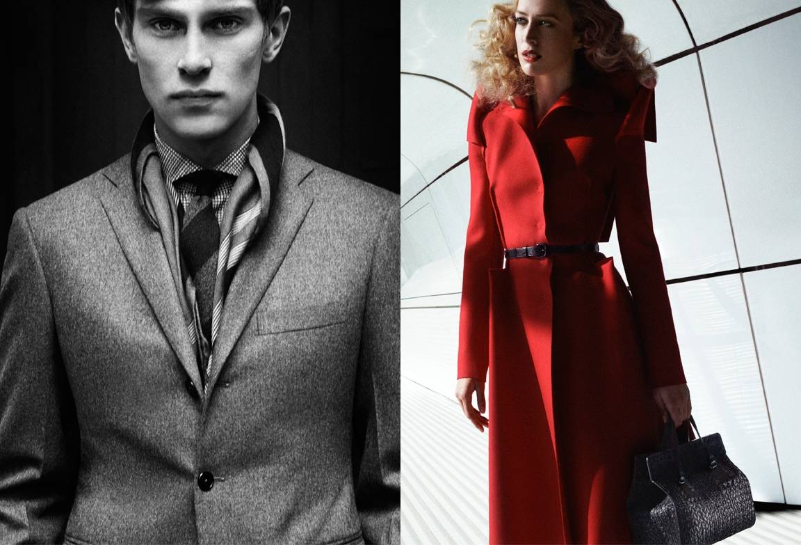 black, grey, blue, plum and pearl white, touches of cool green and muted bronze, as well as vibrant red and yellow. The look is polished and sleek with the women’s silhouette that places emphasis on volume and a men’s silhouette that is exceptionally sharp and tailored.