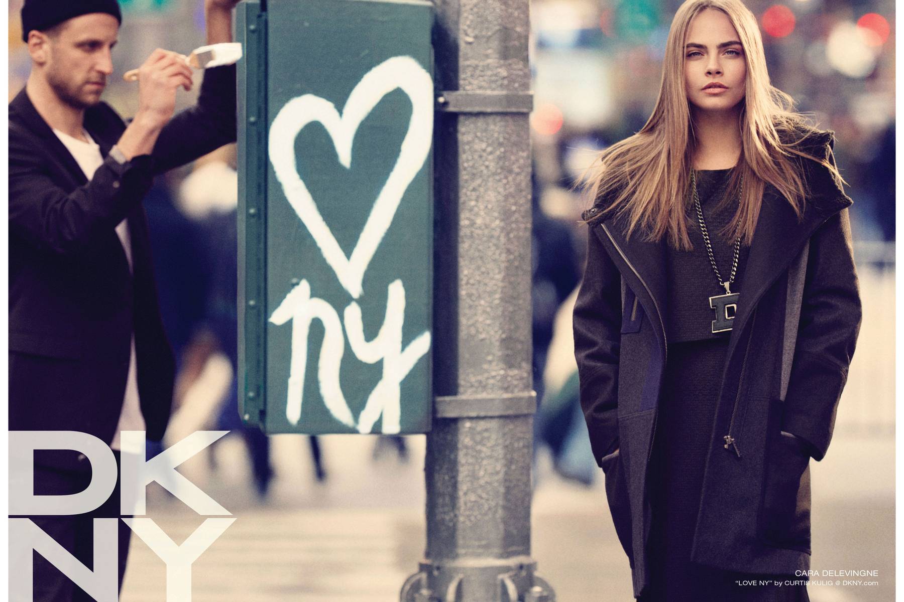 Cara Delevingne, the face of DKNY since 2012, stars in the Fall 2013 ad campaign in Manhattan’s very own Times Square. In the colorful and pop art-inspired upbeat one-minute video, the model stands on top of a taxi cab hand-painted by New York artist, Curtis Kulig. Cara Delevingne stands victorious and poses, showcasing the luxury brand’s new pieces, such as a printed coat and dress, booties and a beanie. Scenes flash back to her sitting on bright red steps, opening up her gray jacket and holding a red leather purse. Next, she struts to a pretzel stand and fiercely toys with the baked good. Black and white footage of male model, Ollie Edwards, interrupt the previous prismatic shots, as he skateboards and walks around the city. When the two meet, their lives blend into a color version once again and they show off DKNY’s latest apparel.