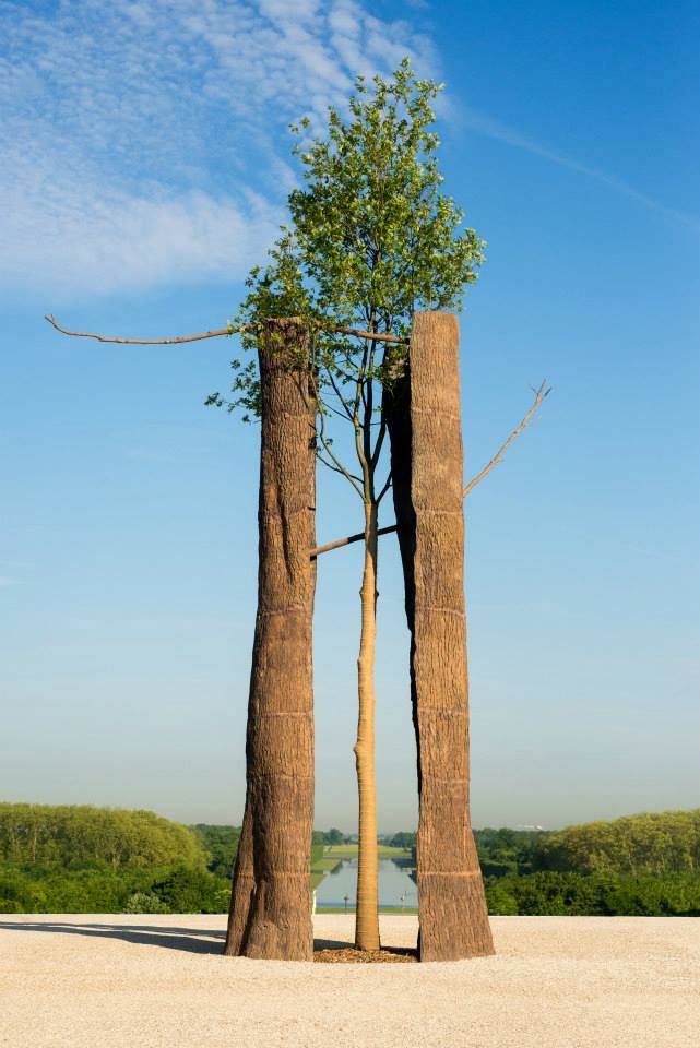 “The relationship of my work with Versailles began after the storm of 1999,” Penone explained. “I bought from the Palace of Versailles one of the cedars blown down during the storm. Its bark was used to make Tra scorza e scorza. The park is a symbolic place summing up western thought and the relationship between man and nature. Built to exalt the power of a man, it emphasizes the strength and power of nature which minimizes the action of man, forced to a sustainable handling work to preserve it. Complexity of the design suggests the multiplicity of looks, and its extansion and grandiosity contrasts with the size of men who travel into it. The man who travels alone in the garden disappears in favor of the spirit of the human community that has generated such an organization of nature. My work causes me a similar reflection: the objective mimicry works cancel my work as a sculptor and focuses attention on the deep understanding of plant growth and the perfect aesthetics found in nature.”