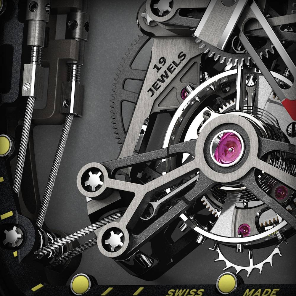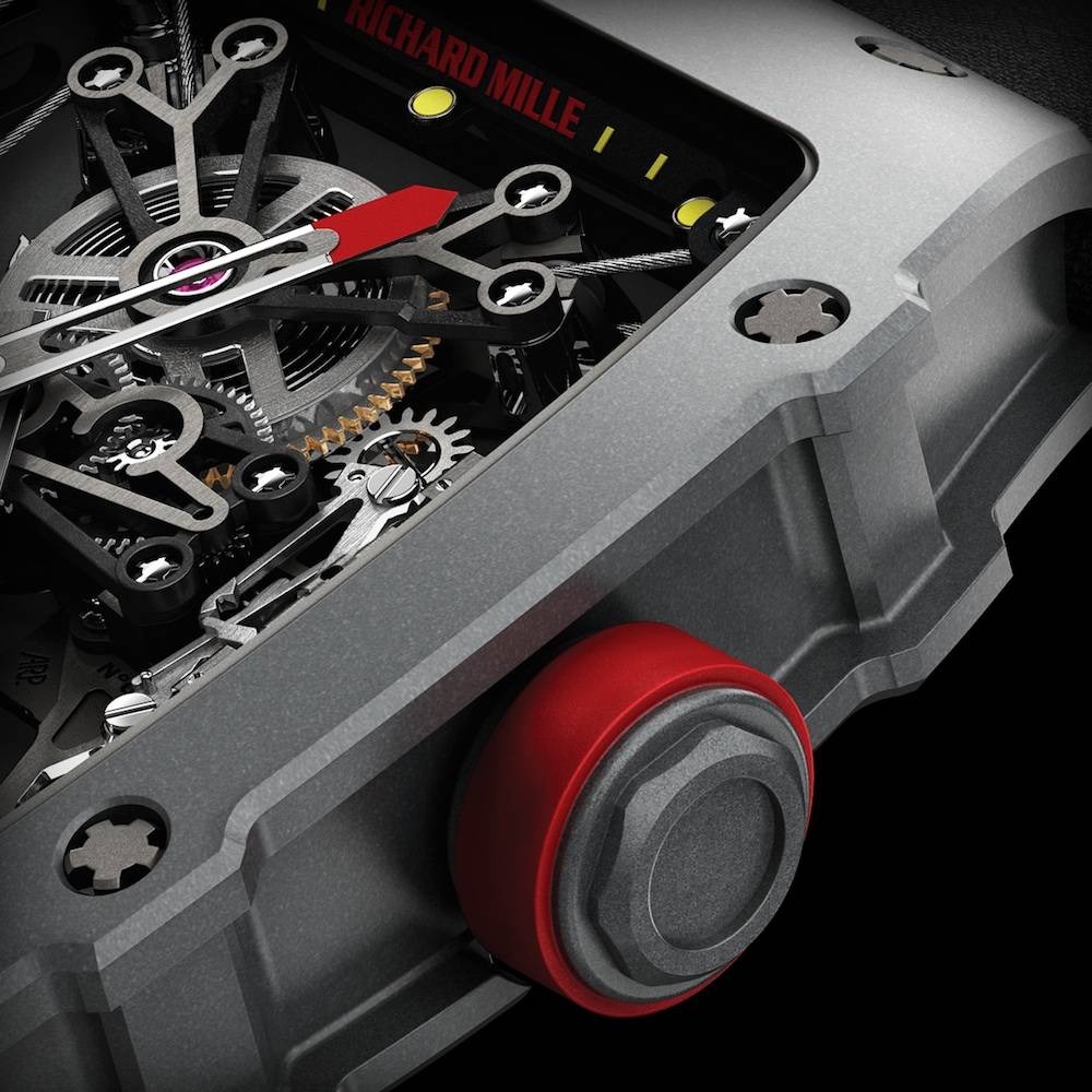 A new version introduced thiis year, the RM 027-01, is even more advanced. The movement is held in total suspension within the case. The baseplate is attached to the case by four 3.5mm thick braided steel cables. A system of tensioners and pulleys keep the cables taut, acting like pylons at the four corners of the movement. It can therefore withstand shocks of over 5,000 G (G-Force, a measurement of acceleration felt as weight – such as the power of an impact).