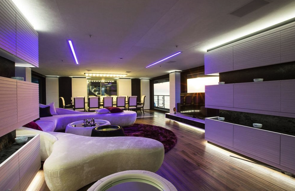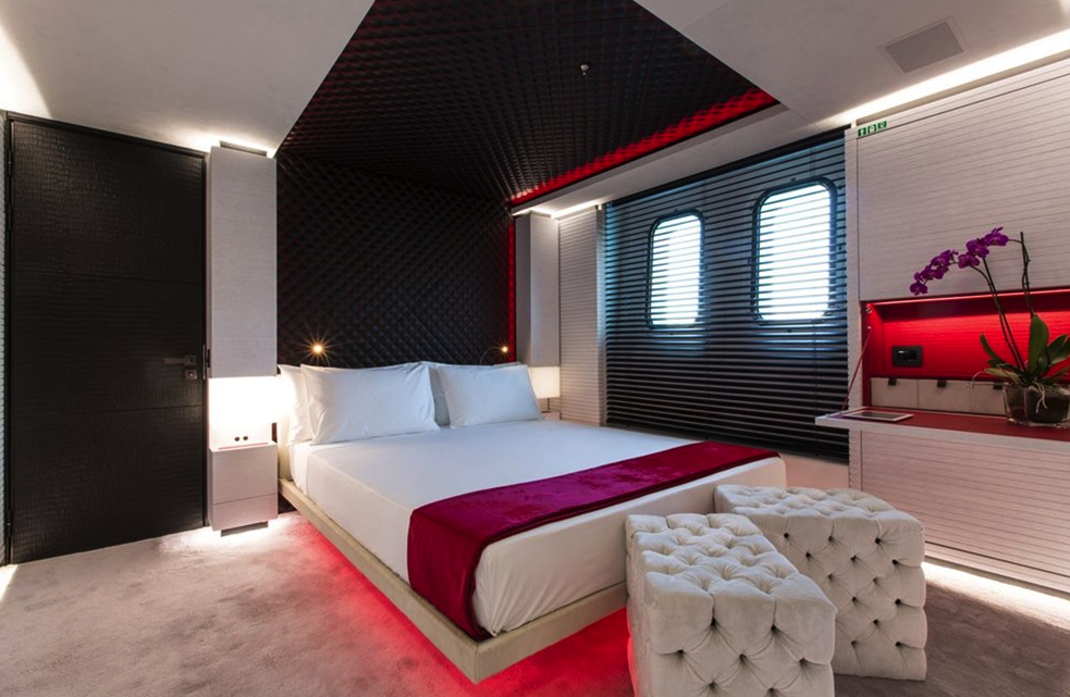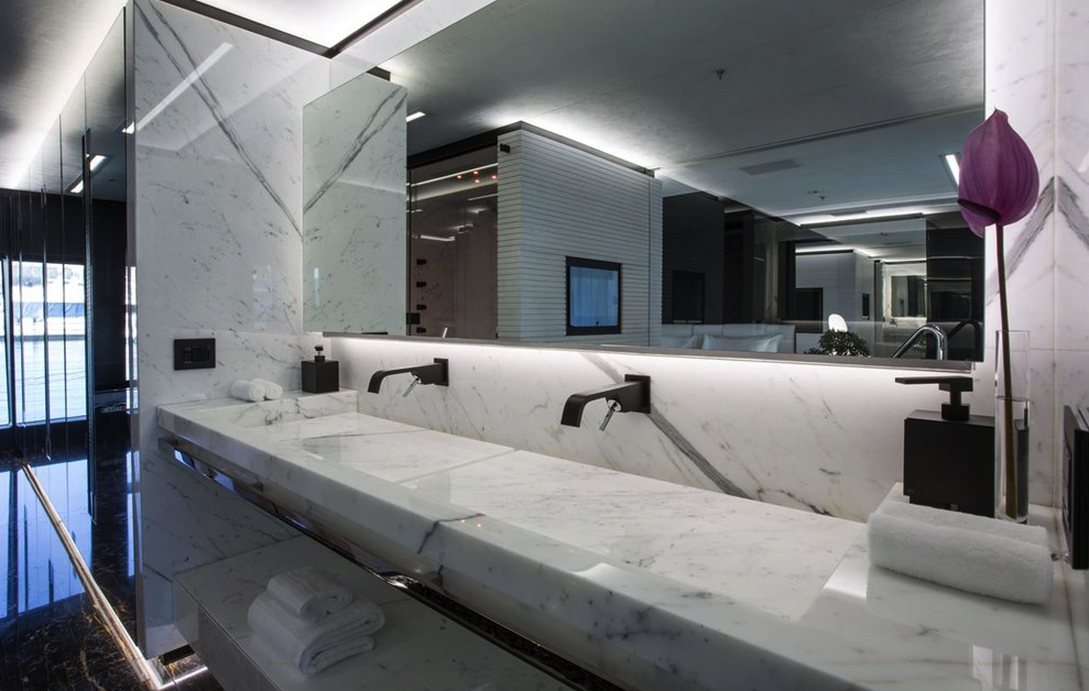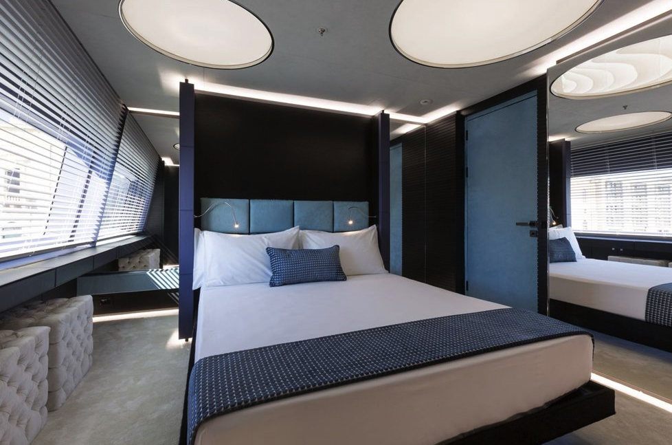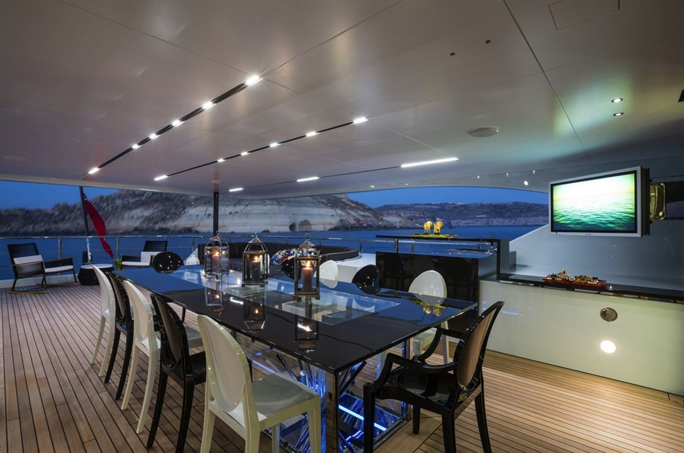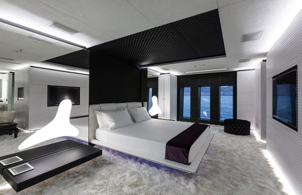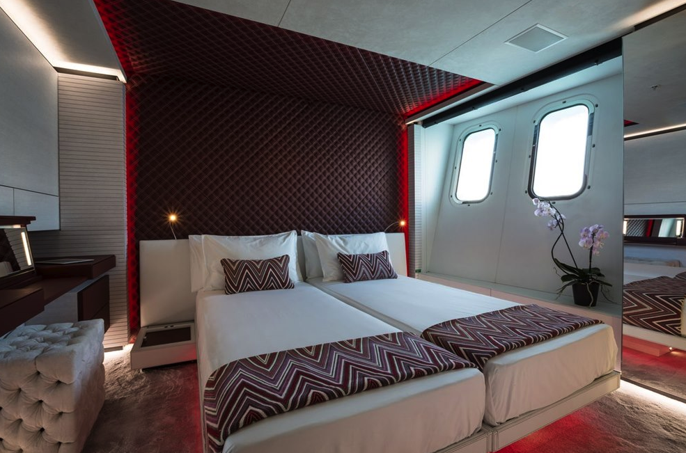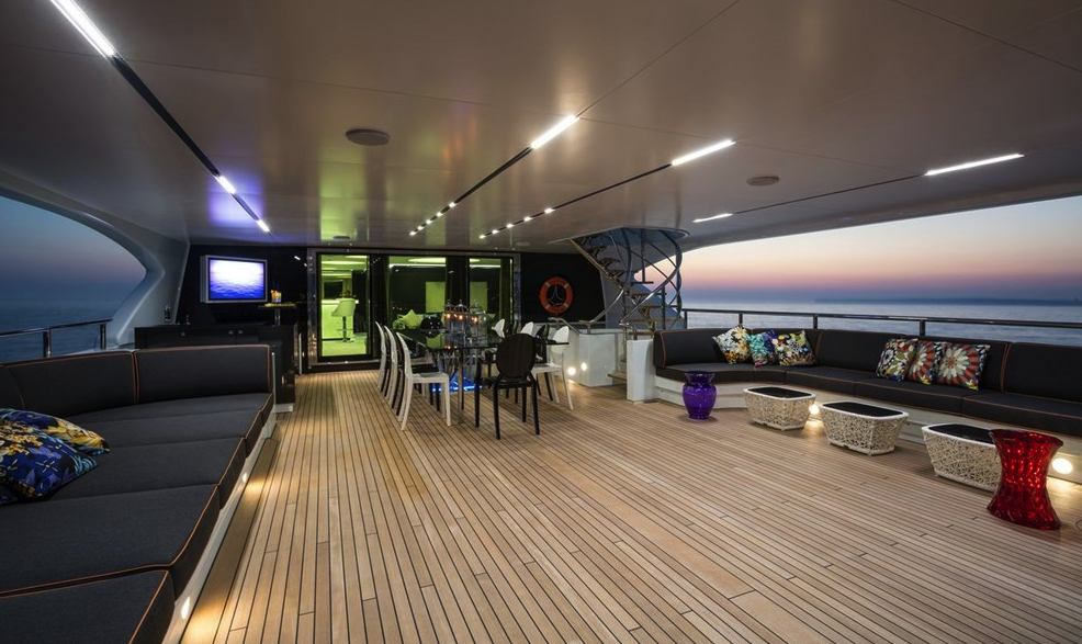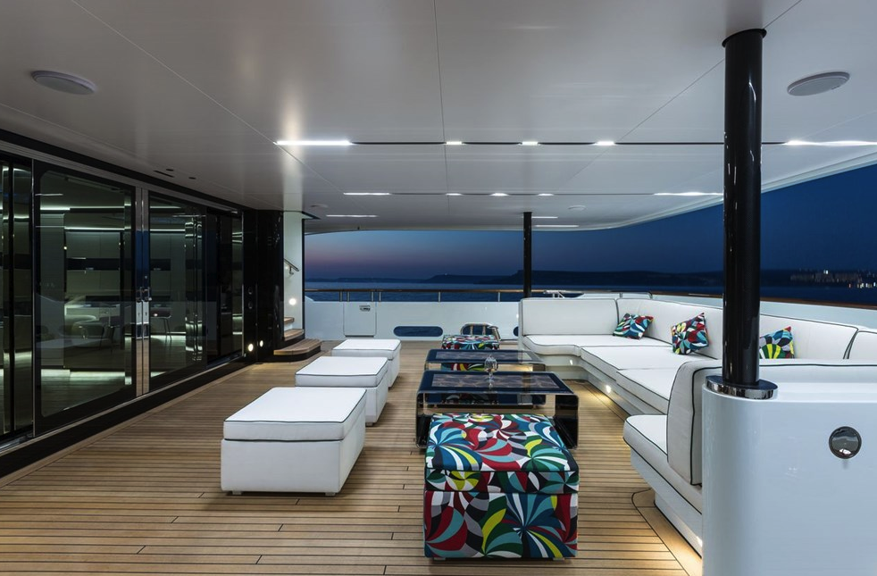 Amenities aren’t limited to the inside of this gorgeous Italian superyacht. Pursuitist reveals the upper deck has its own home beach club, a solarium, gym, minibar, DJ mixing tables and a waterfall pool.