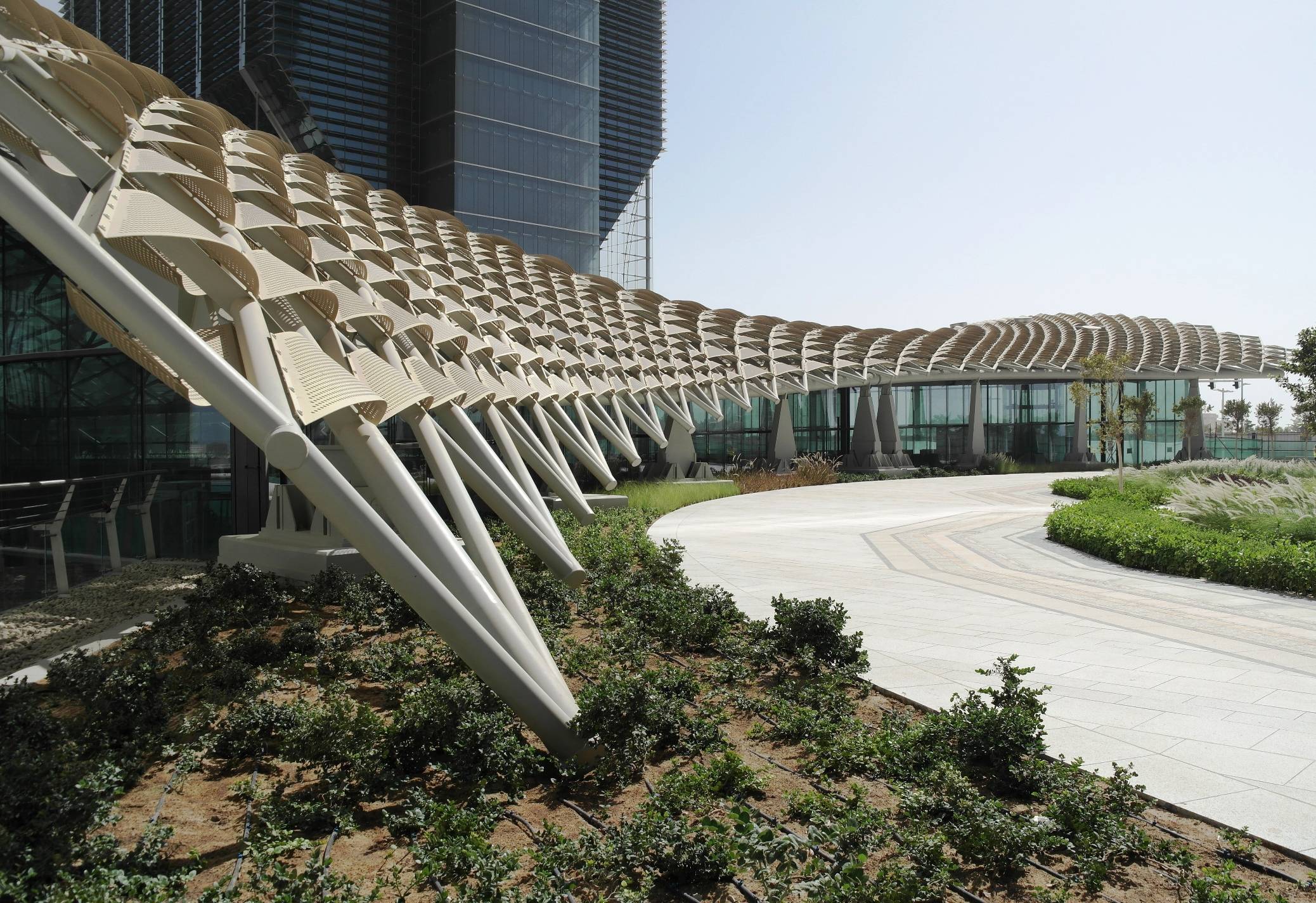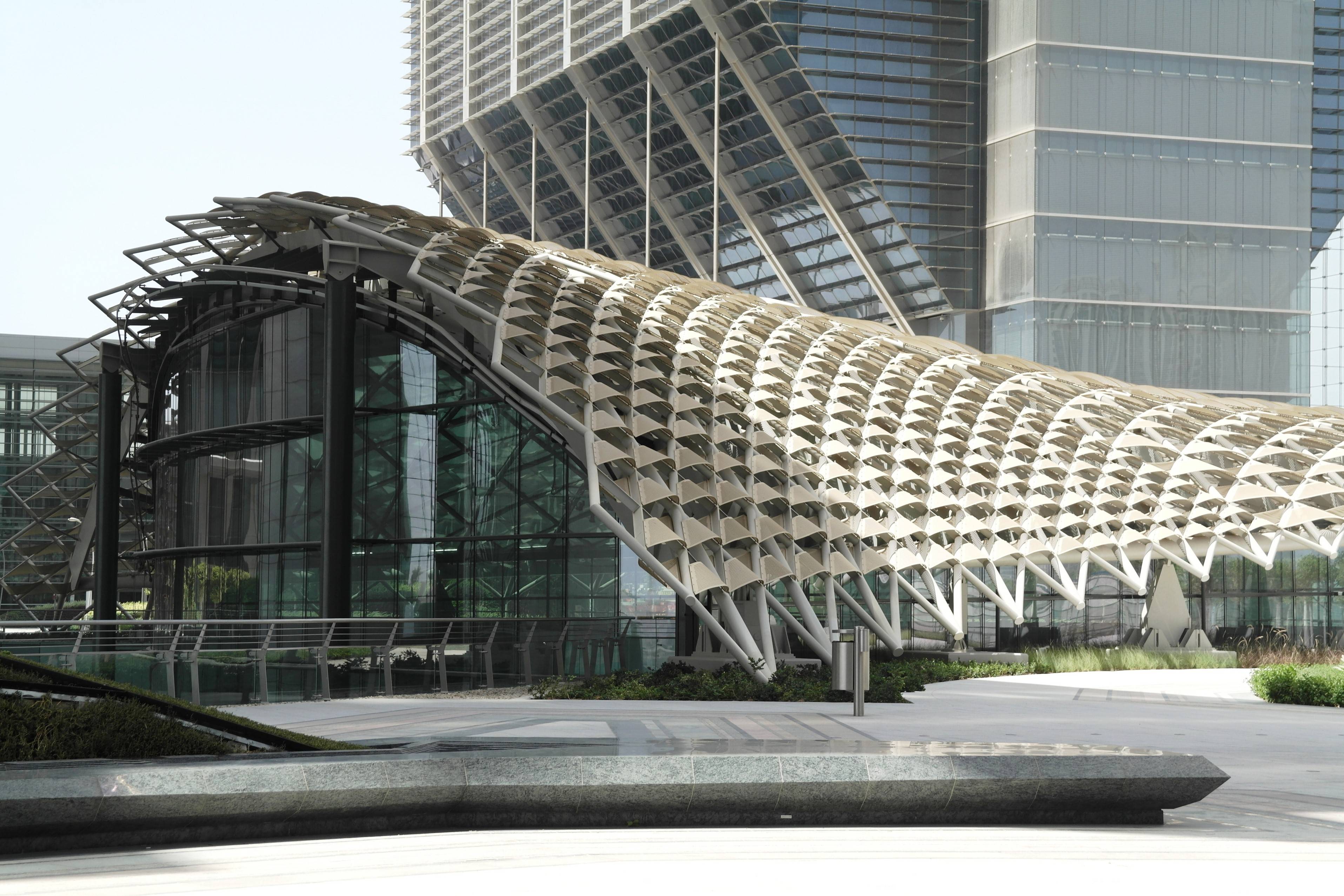 The structure frames the grand entrance and sweeps across the entirety of The Great Room which forms the center of the leisure and lifestyle complex. It seems to seamlessly integrate into the panoramic sky-line view, which overlooks onto the mainland Abu Dhabi waterfront.