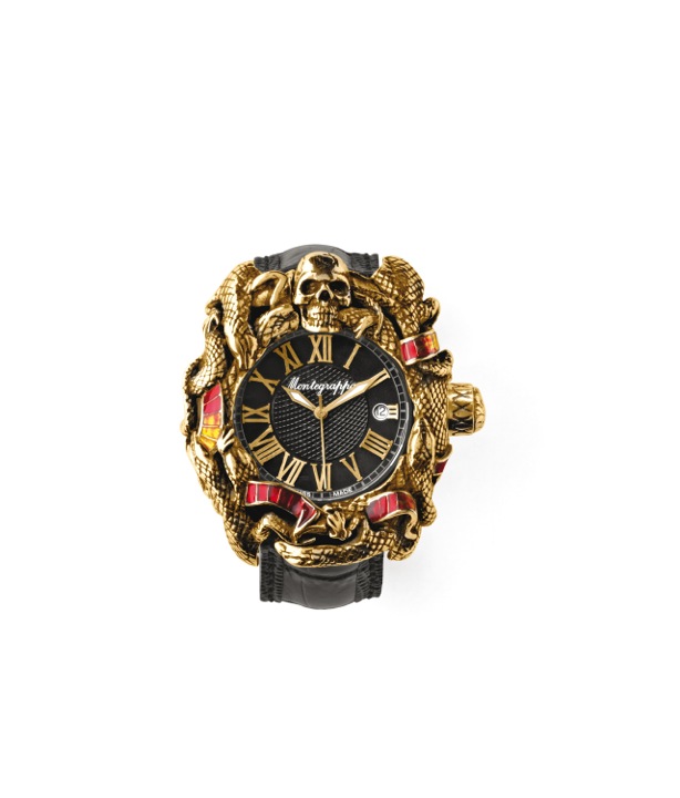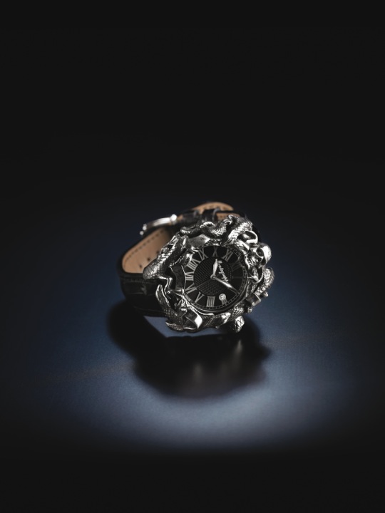 Each watchcase is complemented by a leather strap and skull motif buckle. The black, bi-level, brushed guilloché dial with luminous hands features applied Roman numerals encased by a sapphire crystal. Within the 54×43 mm-diameter forged sterling silver or 18k solid gold case beats the Swiss ETA 2824 movement.