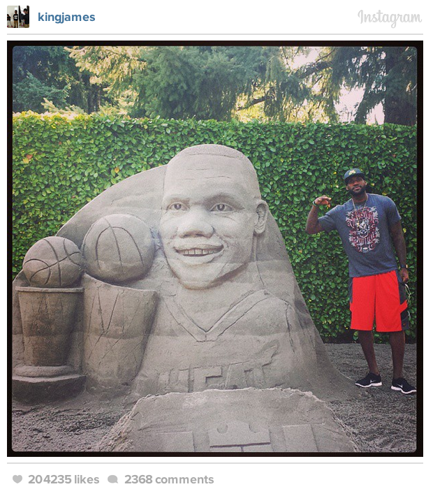 LeBron James was greeted at Nike’s Headquarters in Beaverton, Ore. earlier this week by a massive eight-foot sand sculpture of his likeness. The enormous sculpture was no ordinary sandbox creation, featuring James without his signature headband alongside the two Larry O’Brien trophies he’s won with the Miami Heat. In front, a smaller sculpture, also made entirely of sand, was created showcasing the four-time NBA MVP’s logo.