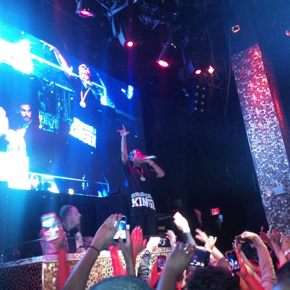 Songz and friends then made their way to a VIP table on the dance floor. DJ Eric D-Lux announced his arrival to the nightclub and the room erupted with cheers as a sea of camera flashes added to the frenzy. Standing on top of his booth, Songz took in the packed club scene, waving to fans and dancing to hip hop tracks. He got on the mic soon afterward and greeted partygoers, wishing a happy birthday to a lucky lady at a neighboring table before jumping into an impromptu performance of his biggest songs including “Say Aah” and “2 Reasons.” DJ Eric D-Lux then dropped “Invented Sex” which then led into “Bottoms Up” while fans roared, belting word for word as Trey led them a capella. All the while leading the charge from his VIP section, the music superstar graciously provided shots to the nearby table that was celebrating a birthday as well as to fans on the dance floor.