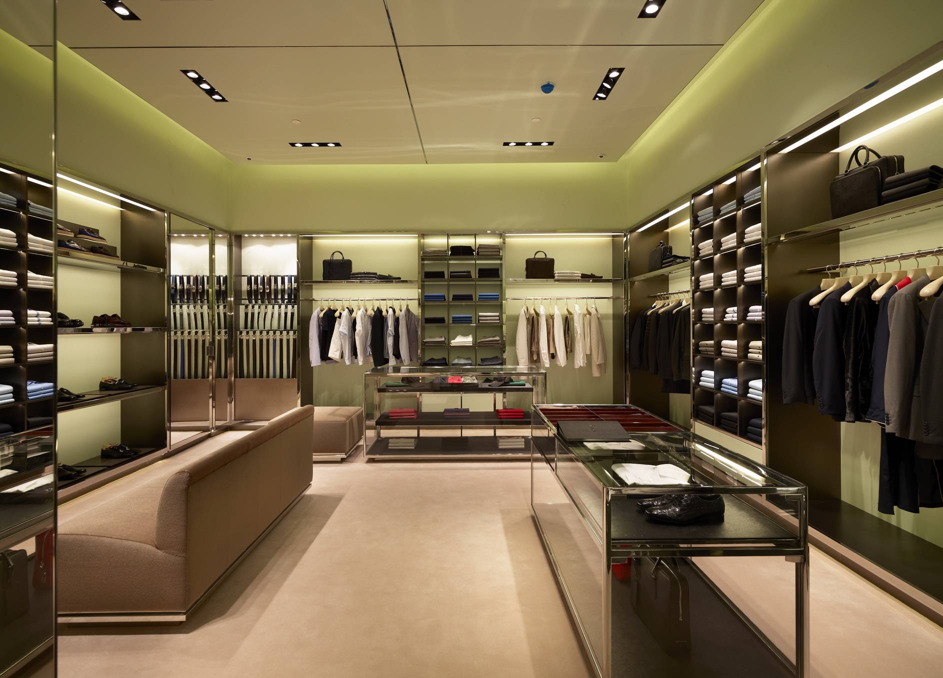 The storefront is covered in black Marquina marble and is characterized by alternating windows and an imposing entrance opening. Inside, the black and white chequered floor – a legacy of Prada’s historic brand image – defines a large space in the center and extends to a series of rooms. Walls covered in pale green fabric and cases enclosed in polished steel frames characterize the surrounding area offering leather goods and footwear; in the latter, circular crystal tables and green velvet “Clover Leaf” sofas, designed by Verner Panton and exclusively reproduced for Prada, complete the furnishings.