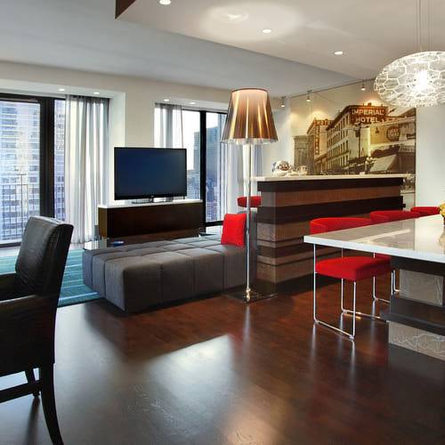 In the true heart of downtown, near almost every tourist attraction you could imagine and right down the street from Milennium Park on one side and the Chicago River on the other sits the highly stylish Radisson Blu Aqua (221 North Columbus Drive). The over 334-room hotel is less than two years old but is already making its mark as one of the must-stay hotels in the city. Not only is it the first North American Radisson Blu Hotel, it’s also the largest hotel designed by a lead female architect (Jeanne Gang).