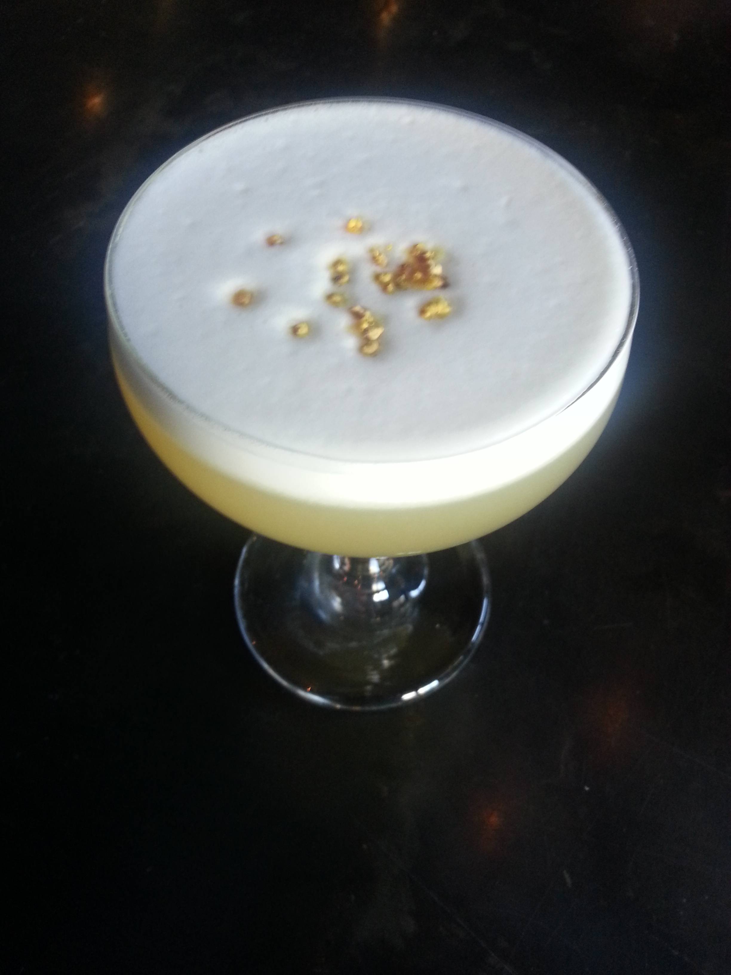 For the Aquavit, head bartender Gabriella Mlynarczyk says she wanted to do a white sangria-style drink with a Nordic/Germanic influence, but wanted to avoid the usual fruity, ice-filled drink. Instead, she infused the flavors of chamomille into the liquor and used Riesling with aquavit, a spirit made from potatoes, to complement the chamomille and honey. Bee pollen is then sprinkled on top as a tongue-in-cheek ode to curing seasonal allergies homeopathically.
