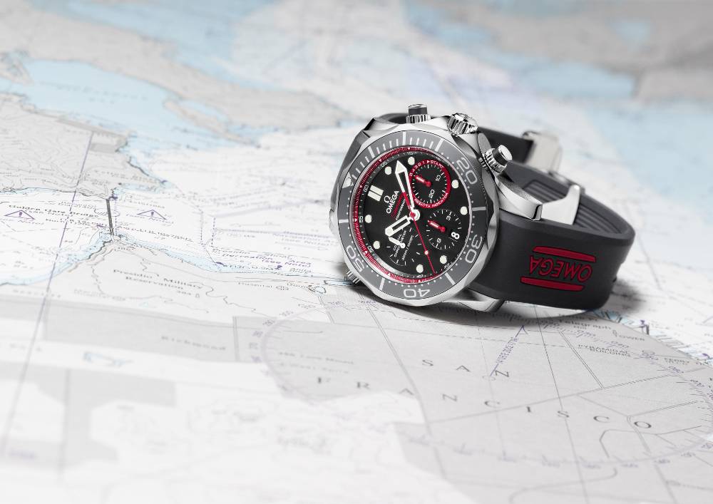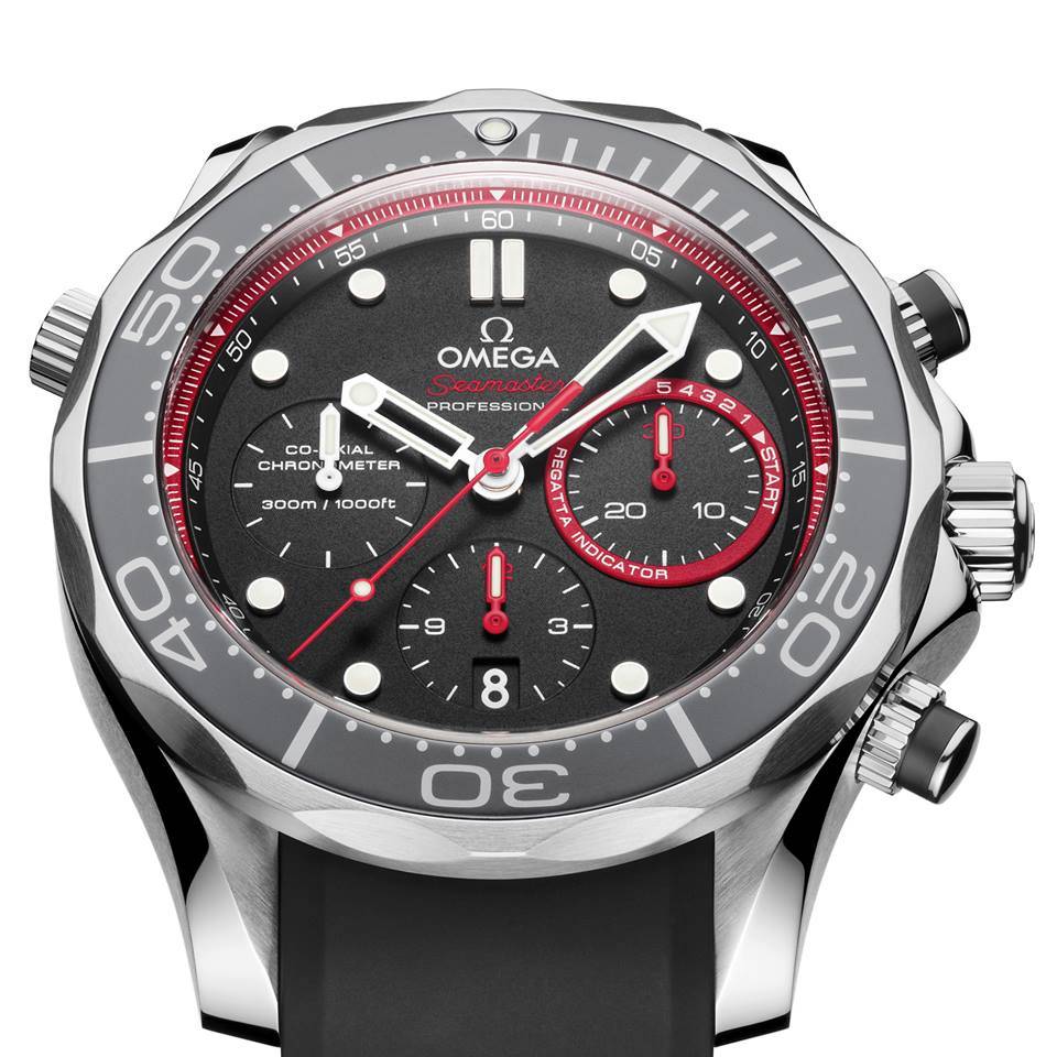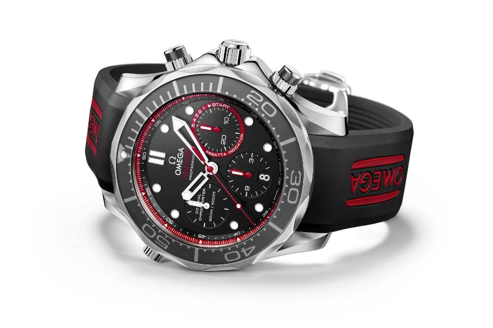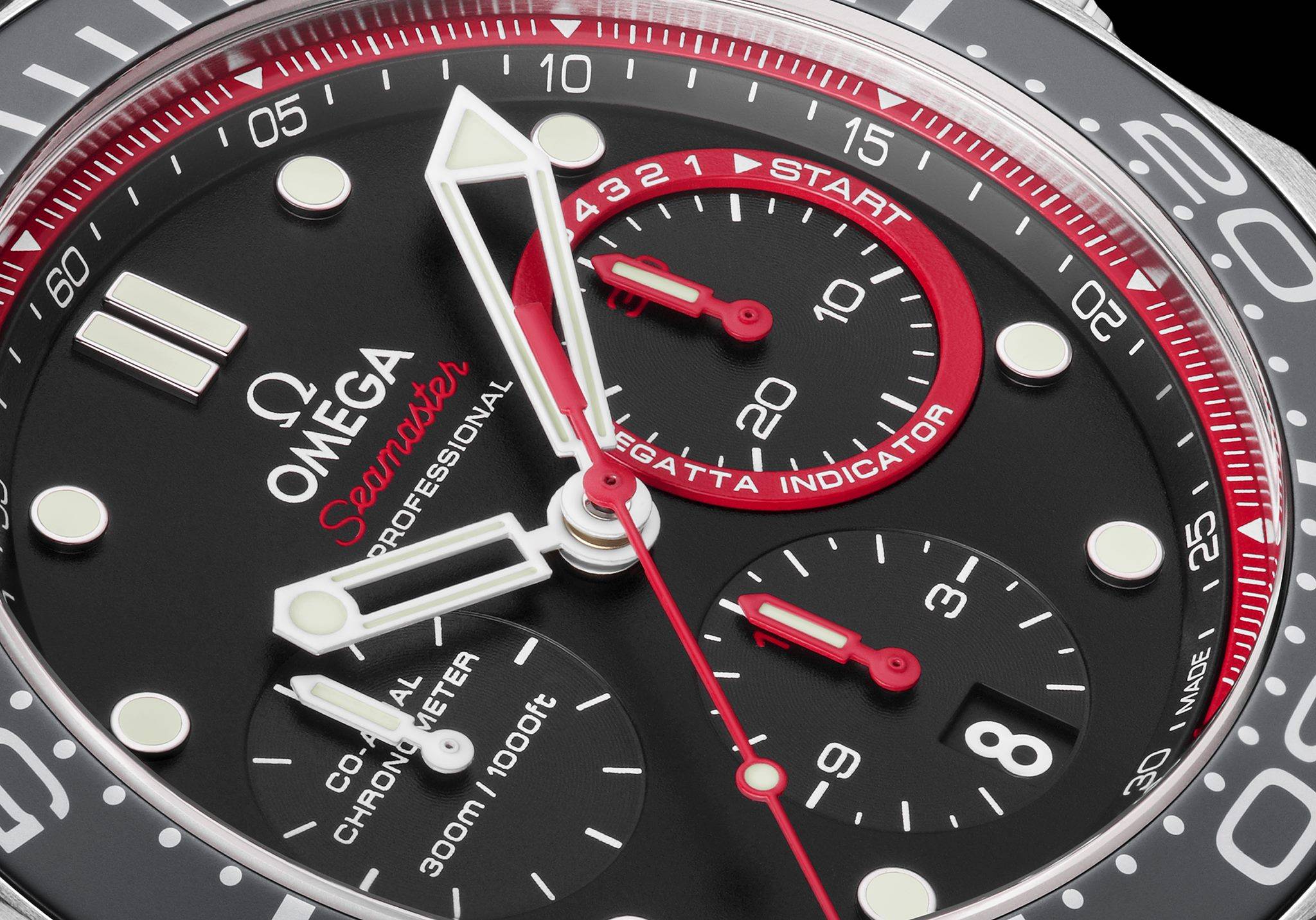 The Seamaster Diver Emirates Team New Zealand begins with a 44 mm polished and brushed stainless steel case with a matte black ceramic bezel ring. The dial is also matte black, encircled by a red seconds track, with skeletonized central hour and minute hands. A small seconds sub-dial is featured at 9 o’clock, and a 12-hour chronograph recorder with a red hand is featured at 6 o’clock, just above the date window. The Seamaster ENTZ has a central chronograph seconds hand, as well as a 30-minute chronograph recorder at 3 o’clock (with a red hand and a distinctive red ring marked with a scale that indicates the five-minute countdown to the start of a regatta).