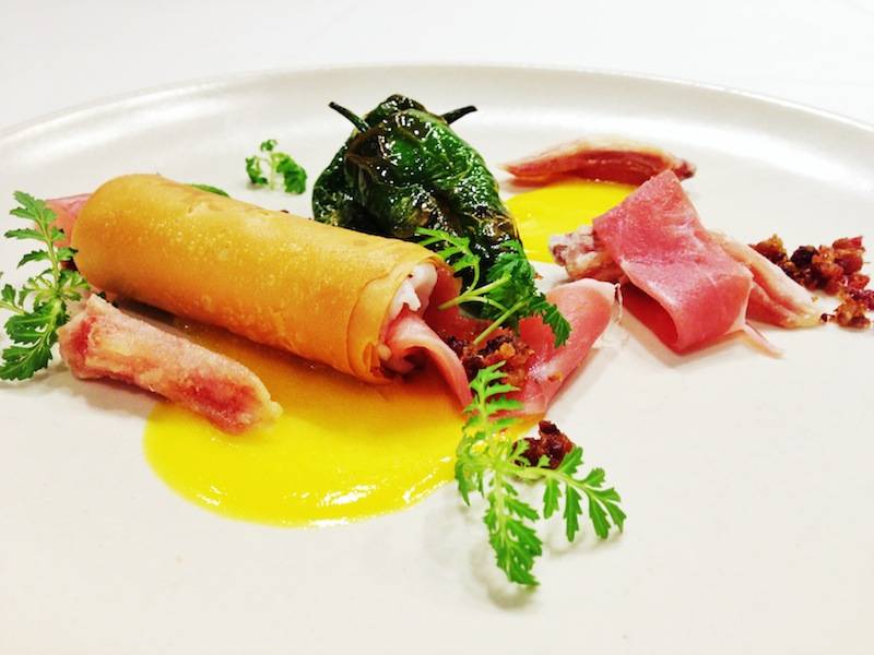 Traditional Empanadas with a contemporary take are the third course. The spin on this popular dish arrives with duck prepared in three unusual ways, air dried duck breast, crispy duck tongue, duck egg emulsion adorned with iberico crumble, and padron peppers.
