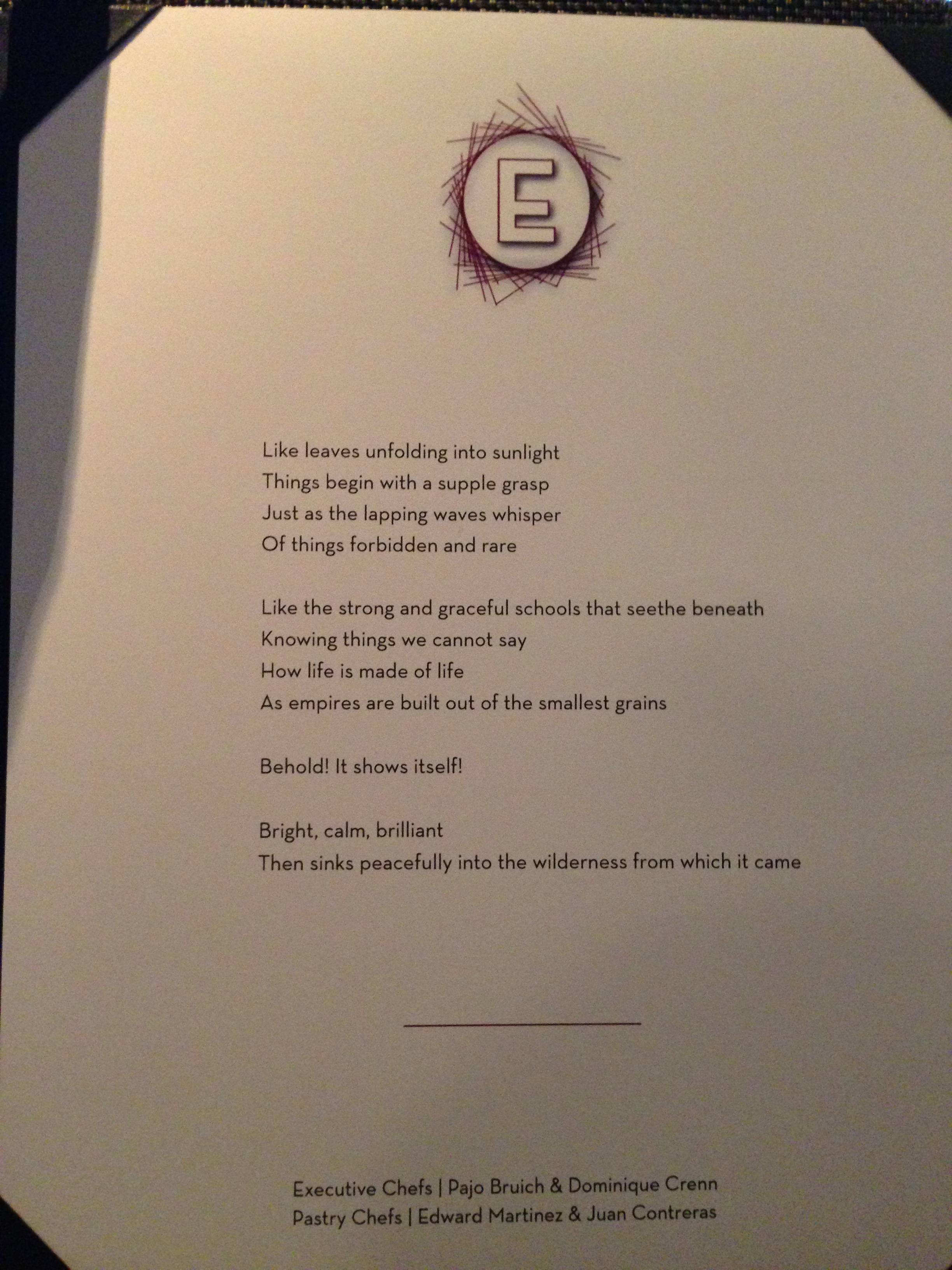 Executive Chefs Crenn and Bruich alternated courses, which allowed their work to be proudly showcased and was creatively displayed in the form of an abstract poem that was created by Enotria staff member, Jesse Hill.The Grand tasting menu was $165 with the added wine pairing for $95.