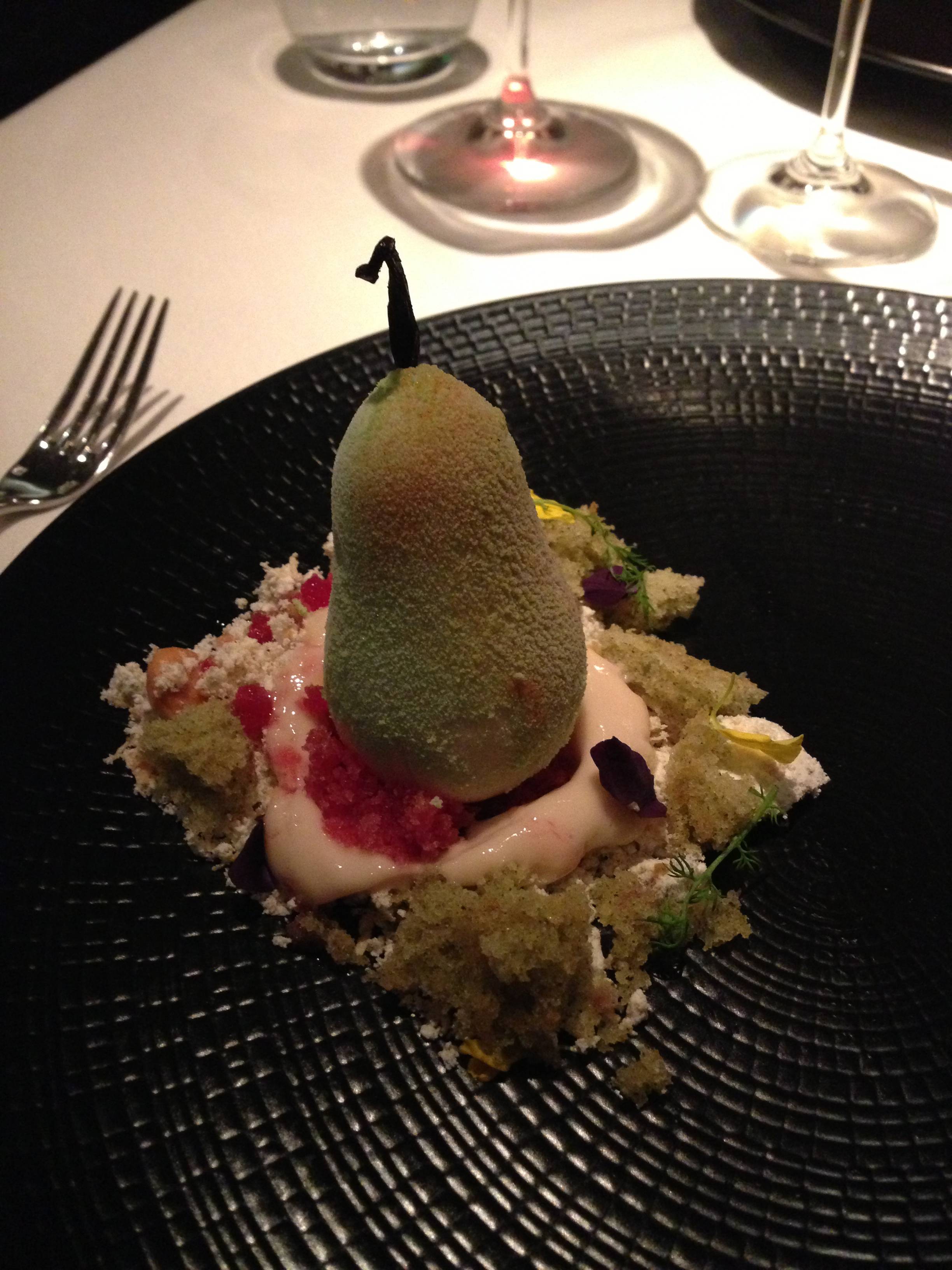 Crenn’s final tantalizing course was a thrilling palate stimulator of pear sorbet that was perfectly molded into the shape of a pear and sprayed with red sangria ice, white port emulsion, and pear skin puree leaving a memorable completion to the evening.
