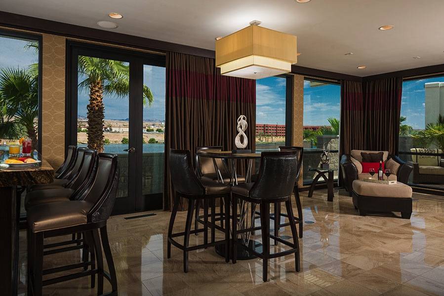 The Gold Rush Villa, located next door to the resort and next to the hotel pool, was designed with contemporary furnishings and color schemes and accented with modern art fixtures, and high tech amenities. The three bedroom spacious retreat features floor-to-ceiling windows overlooking the Colorado River, a full kitchen, bar and expansive living area as well as a private garage and courtyard that sets the scene for the perfect relaxing evening or morning cup of coffee.
