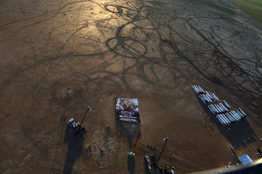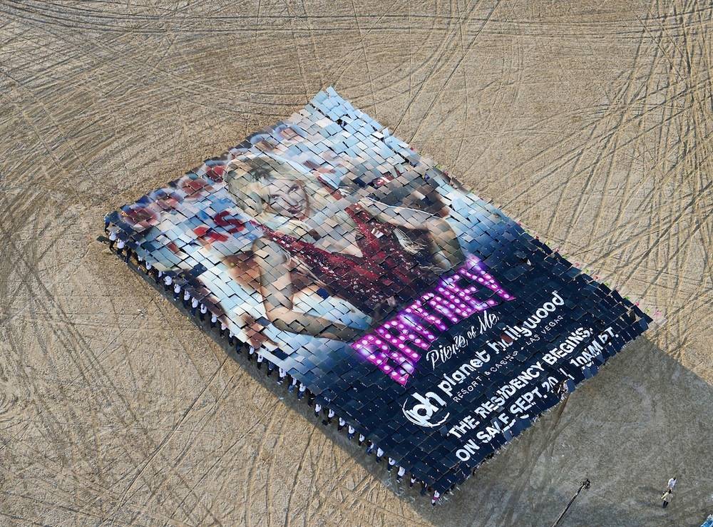More than 1,300 people coordinated a large card stunt, more than 10 stories long and seven stories across, in the remote location to formally announce the start date of the star’s two-year Las Vegas residency show, “Britney: Piece of Me.” Britney will simultaneously usher in a new era of entertainment in Las Vegas along with the new year, as the show debuts over New Year’s Eve weekend on Friday, Dec. 27.