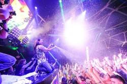 Kicking off the weekend of festivities on Thursday, Grammy Award-nominated artist Steve Aoki spun his classic sounds while entertaining the crowd with his signature antics and customized props from cake-throwing and champagne-spraying, to his C02 hand guns and Indian “Winnetou style” head piece that is fully covered with color changing LED lights — all part of the fun of his “Neon Future” party.