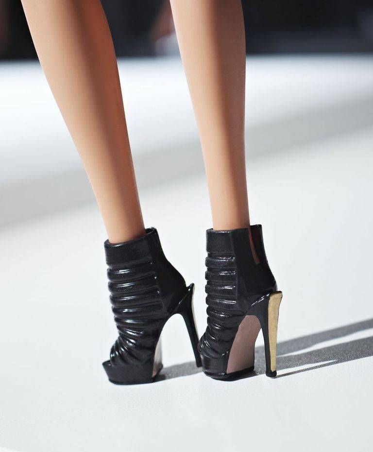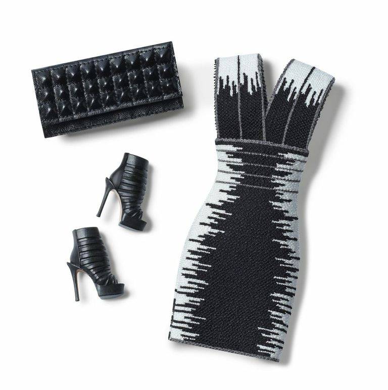 The Hervé Léger by Max Azria Barbie® doll is clad in a scarlet bandage dress, accented with a black corset harness belt, black gladiator boots and a signature black and gold clutch. The item also comes complete with a second runway-inspired, black and white jacquard dress, open-toe booties and a black studded clutch.