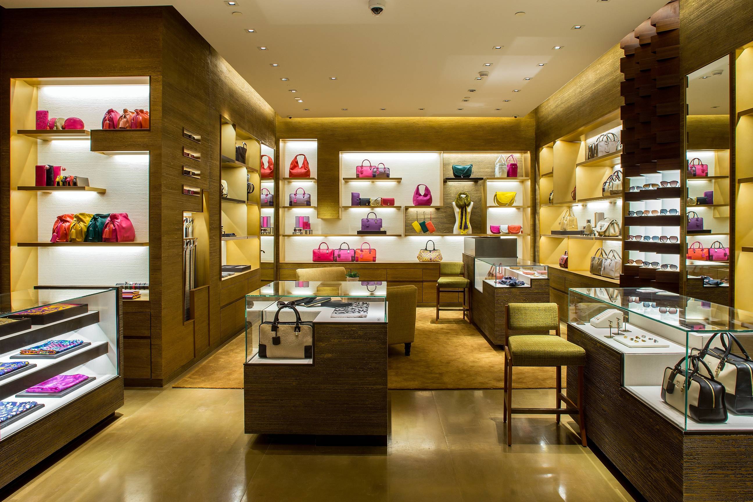 in patinated brass and smooth smoked larch wood and the entrance area is made from slabs of smooth Madagascar stone. The brand’s sunglasses, belts and silk goods will be displayed around the entrance, while Loewe bags will line the walls.