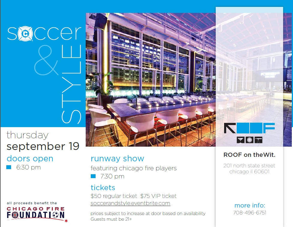The ROOF Runway Series at ROOF on theWit (201 North State Street) has been great this year, but I’m sad to say it’s coming to a close. While this latest event may be the last of the year, it’s good to see that the series is going out with a bang. On Thursday, September 19, The Chicago Fire Foundation will host a fashion show featuring Chicago Fire players and coaches. The Soccer & Style Event will see the players and coaches rocking the season’s hottest looks supplied by Diesel, Penguin and Chicago Fire Apparel.
