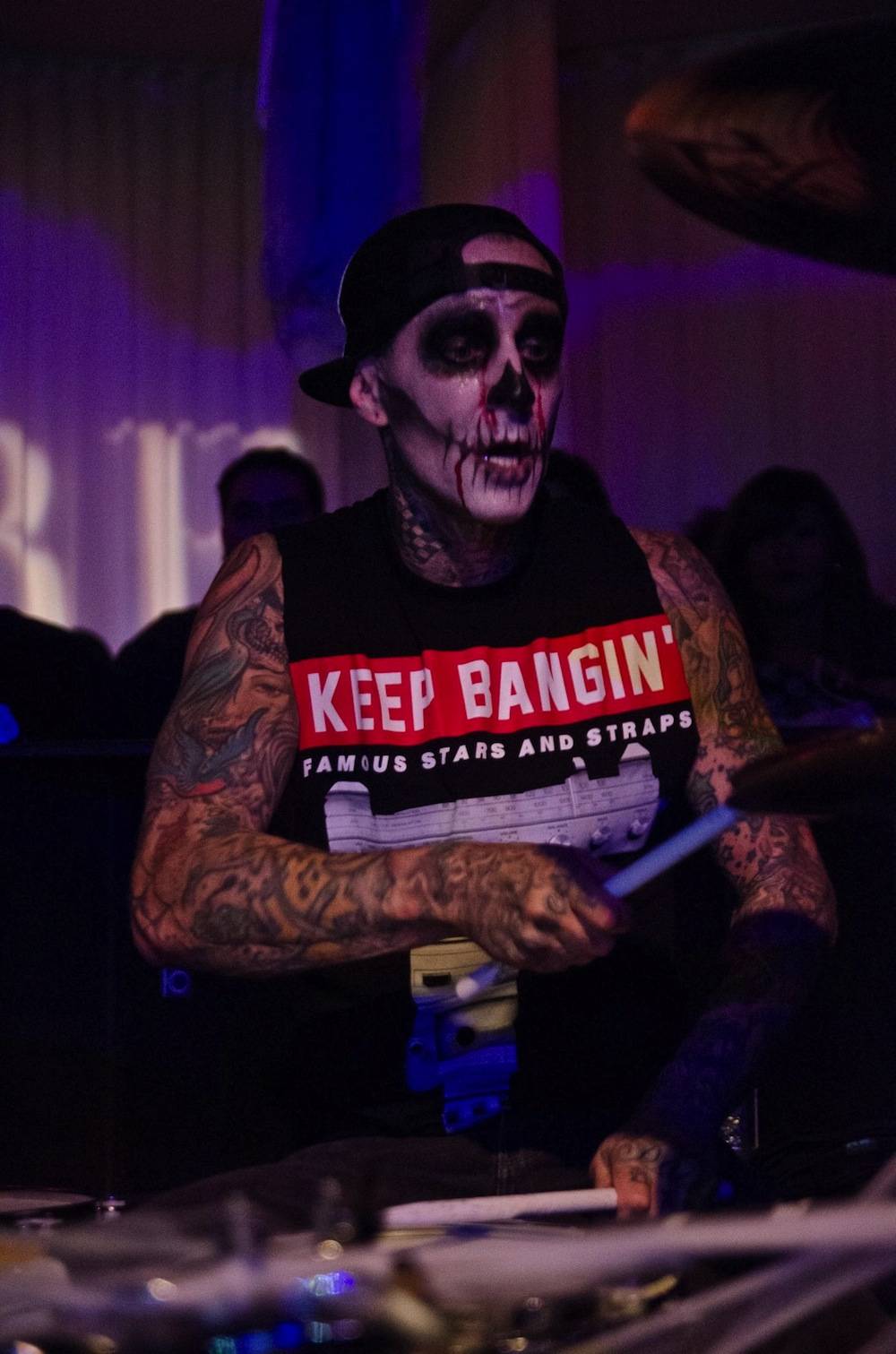 The entire nightclub was decked out with cobwebs, eerie skeletons, floating coffins and more, guests were clad in their Halloween best to catch a glimpse of the unrivaled duo. Arriving just after 12:30 a.m. the pair made their way into the nightclub and took a seat at their VIP table located on stage. Barker and Mix Master Mike both dressed for the occasion with their faces fully painted as spooky skeletons began their set around 1 a.m.