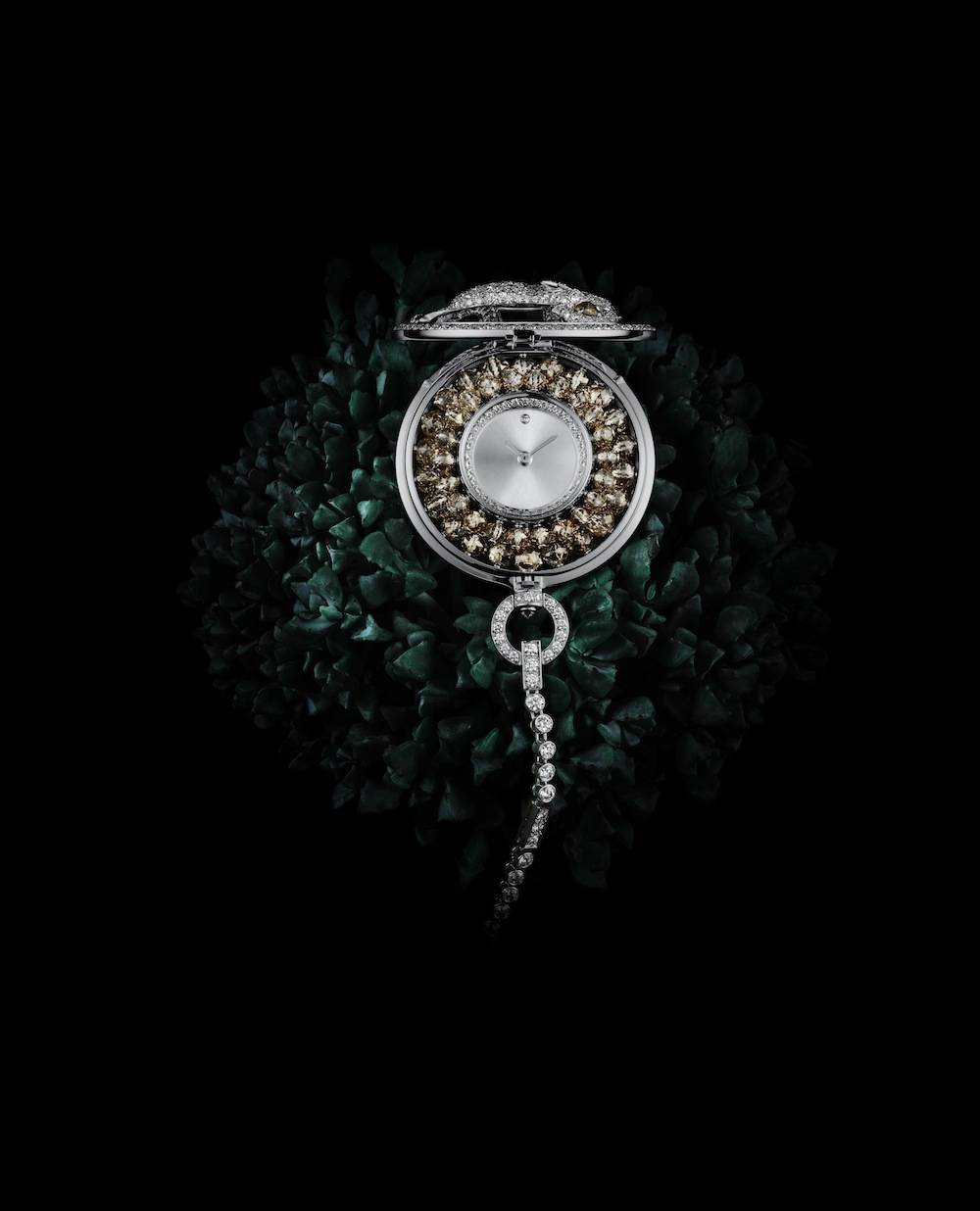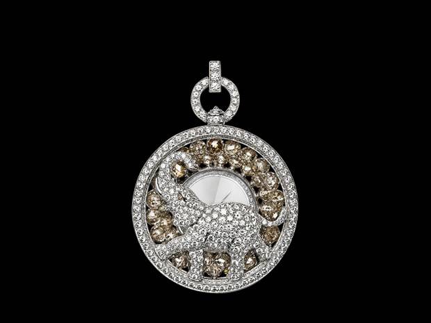 Like many of the watches in Les Heures Fabuleuses, the pocket watch is convertible: it is a watch with a detachable chain in the form of a diamond riviera-style necklace, the clasp of which is set with a single large rose-cut diamond. The cover is designed as an elephant, set with round brilliant diamonds of various sizes. It is hinged to life up to display the time on the dial, the perimeter is set with spectacular brown diamonds that are beaded. The movement is quartz.