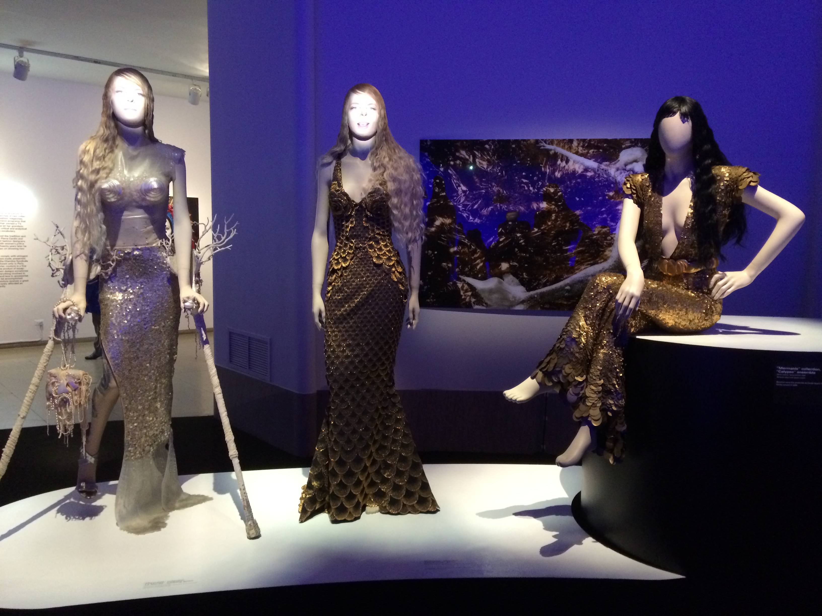 As guests wandered from room to room reflecting on the various themes, ranging from Parisian street culture to singing mermaids, even sadomasochism, Gaultier’s superbly crafted and detailed garments, quite literally, came to life. Using high-definition audiovisual projections, many of the mannequins blink, smile, and even whistle, as visitors walk by. A mannequin of Gaultier, dressed in his signature stripes, speaks to guests in his own flirty voice.