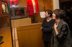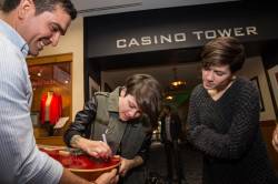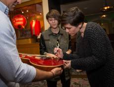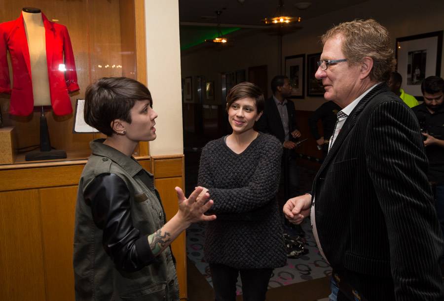 Indie rock duo Tegan and Sara made a special appearance at the Hard Rock Hotel to check out their one-of-a-kind memorabilia showcase on Thursday. The twin sisters posed for photographs with fans and the display, which symbolizes their unique career milestones as internationally celebrated songwriters, performers and artists. The case features various pieces of Tegan and Sara’s musical history including a drumhead, cropped red leather jacket and red blazer worn during a performance on “The Tonight Show with Jay Leno,” as well as an acoustic guitar used during a recording of their live album and DVD titled “Get Along.” After, they met with Curator and Creative Consultant Warwick Stone who gave them a behind-the-scenes tour of his studio to see more rare memorabilia.