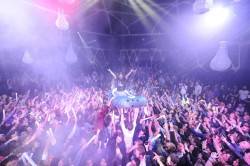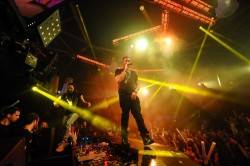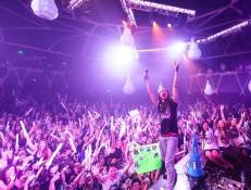 Nearing 2 a.m. a dozen of Hakkasan’s staff paraded around the deejay booth and presented Aoki with a four-tier birthday cake topped with a “Neon Future” branded champagne bottle. The artist was thrilled and placed the cake atop of the DJ booth for all of his fans to see. As the night went on, Aoki continued the madness as he crowd surfed in his iconic raft, sprayed partygoers with champagne, caked a few lucky fans and blasted CO2 into the air with his custom made CO2 guns. Nearing the end of his set, Aoki welcomed a special guest for an impromptu performance. One half of the Dutch Eurodance duo 2 Unlimited, Ray Slijngaard, hopped atop the DJ booth and performed for thousands of partygoers.