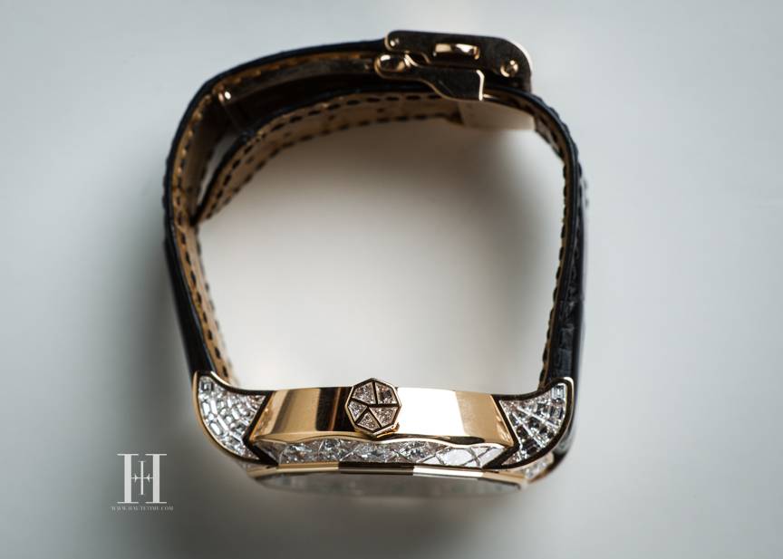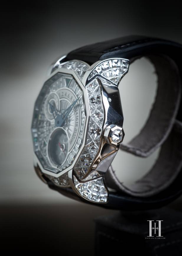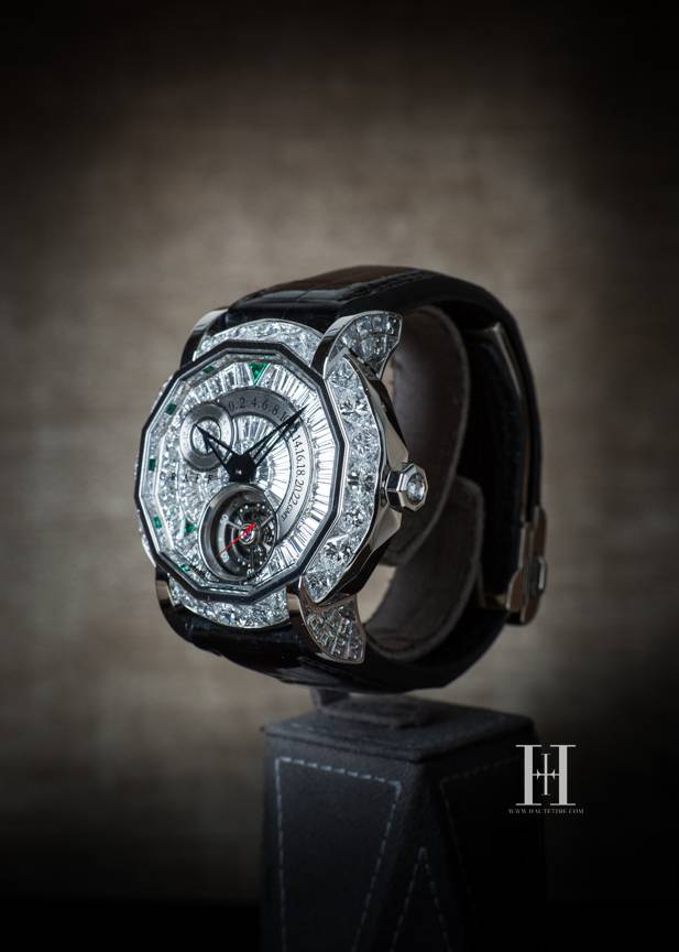 Limited to an edition of 5 pieces, this 47mm white gold men’s watch is set with over 35 carats of diamonds. The bezel is set with 24 diamonds, while the face features a mosaic of invisibly set trapeze and baguette diamonds and an emerald triangle at 12 o’clock and 7 o’clock, as well as further baguette cut emeralds circling the dial itself. The balance weight, bridge and rotor are also all decorated with baguette diamonds.