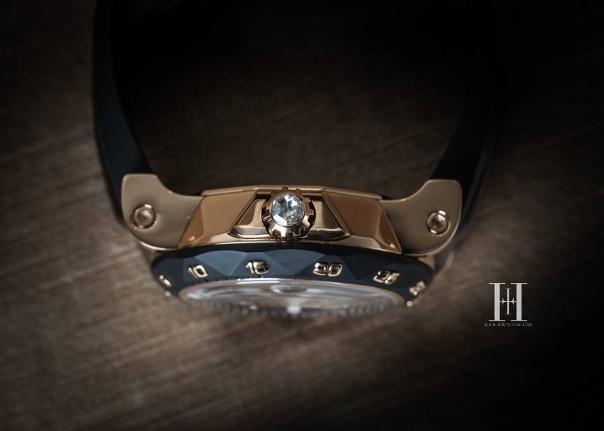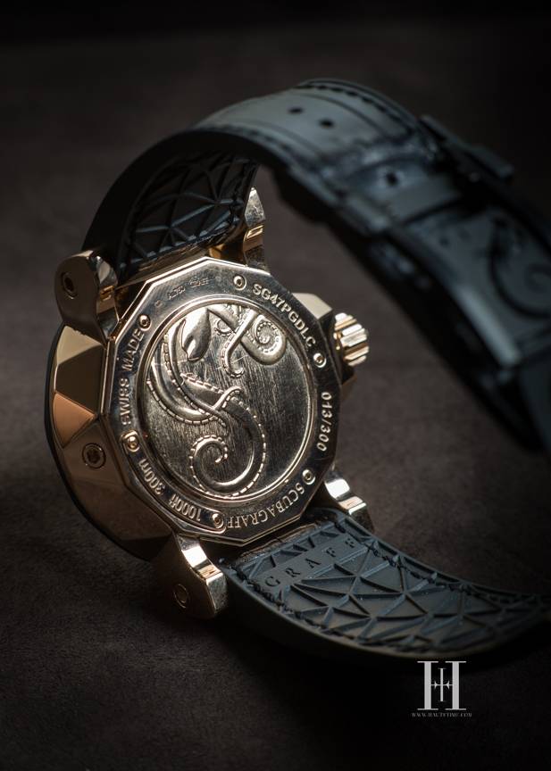 This 47mm men’s diving watch features a black DLC and rose gold faceted case with a decompression valve on the case side and 30-minute countdown indicator to help divers manage their time and oxygen level. The black dial features hands and hour enhanced with luminor for optimal readability and the watch is guaranteed water-resistant to 300 meters. The caseback and folding clasp are hand engraved with an octopus motif.
