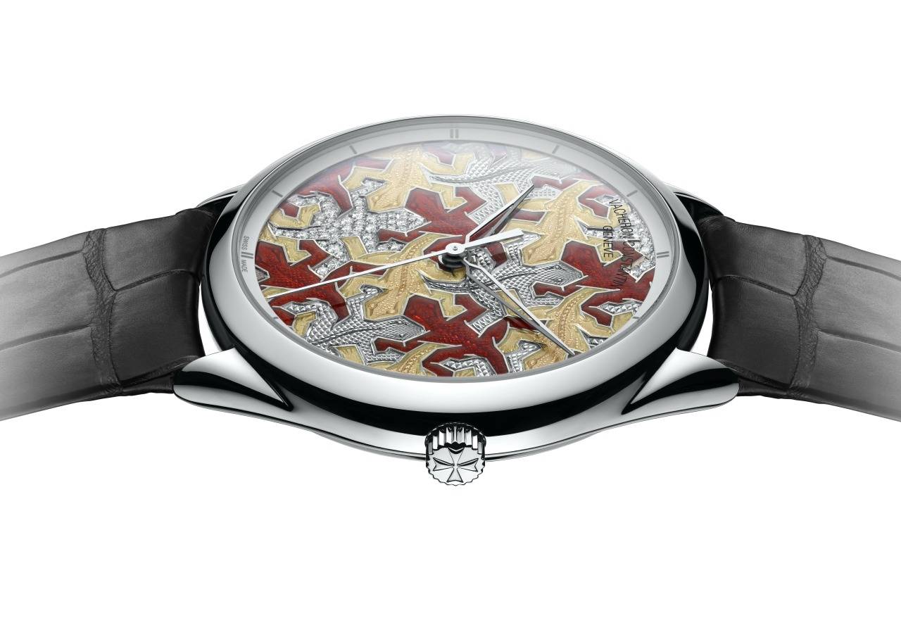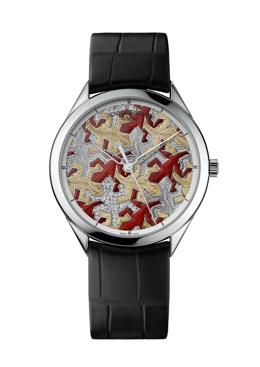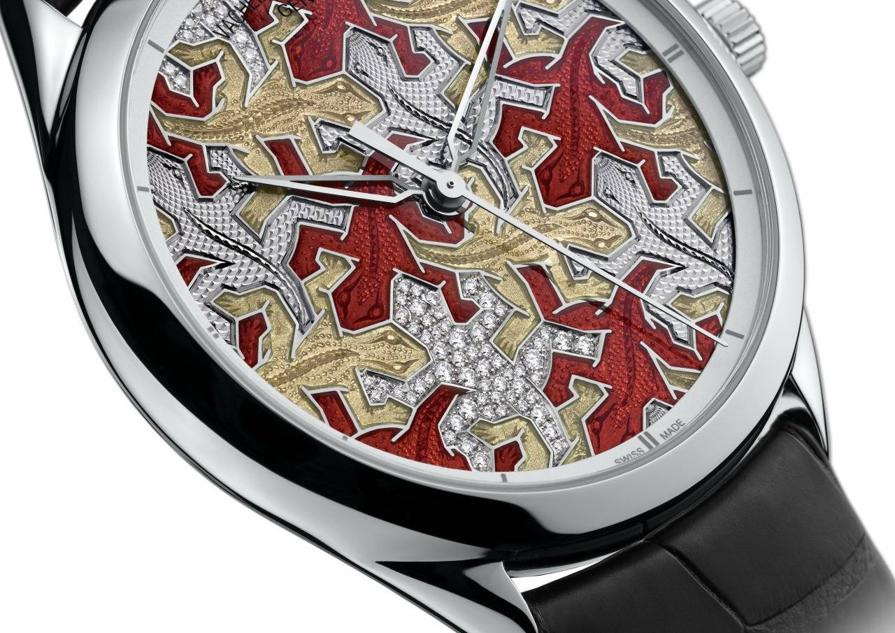 The third dial is inspired by Escher’s Reptile lithographs, and depicts an army of red and brown lizards, created using engraving, grand feu enameling and guilloché techniques. The coats of some of the lizards are set with diamonds; others are guilloched to highlight their tiny scales, measuring just a few tenths of a millimeter.