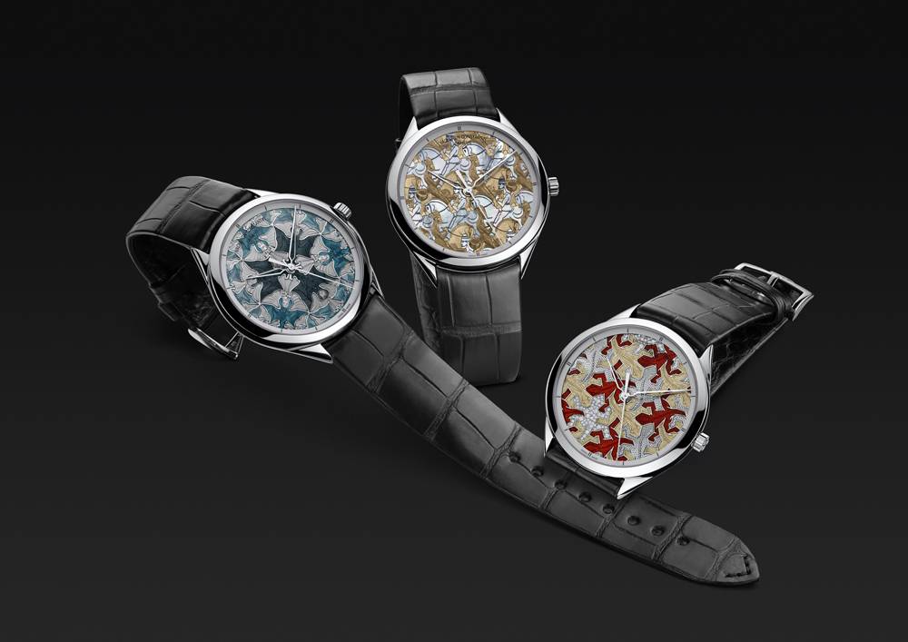 This trilogy of enameled watches is the second installment of the Les Univers Infinis series, part of the Metiers d’Art collection. Les Univers Infinis is a tribute to Dutch artist Maurits Cornelis Escher, an early 20th century artist who was fascinated with the technique known as tessellation: repeated graphic patterns. Escher was a gifted graphic artist, known for his mathematically inspired woodcuts and lithographs. His fascination with tessellation is represented on the dials of the Univers Infinis trio of watches, which are filled with perfectly interlocking repetitive motifs, thereby creating a world of optical illusion and perspective. They are created using a blend of artistic crafts, including engraving, enameling, gemsetting, guilloché and marquetry.
