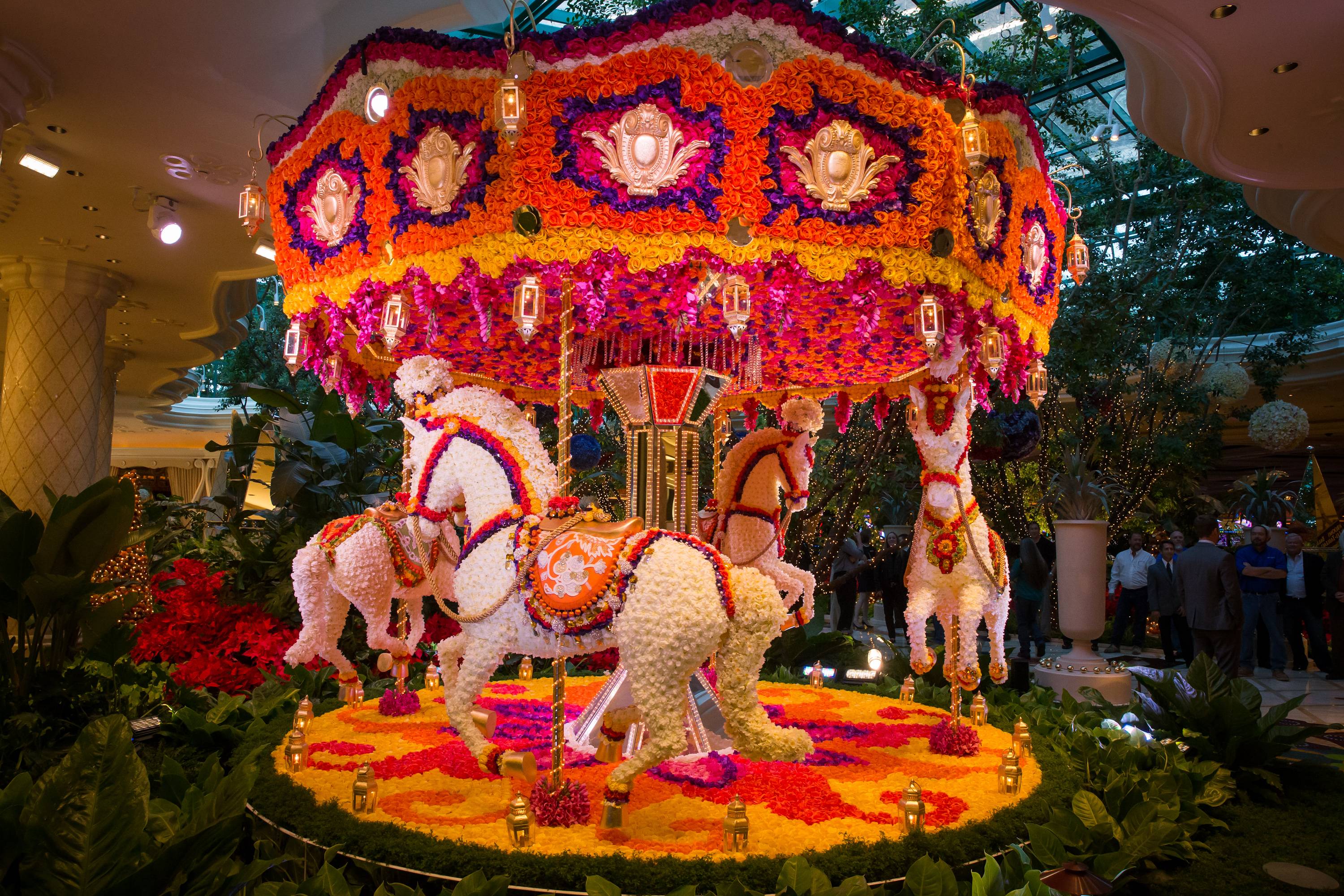 The installations were crafted by Wynn Design and Development and Forte Specialty Contractors. Constructed with a core made of fiber-reinforced plastic, the sculptures are adorned with more than 110,000 flowers, artistically arranged in a vibrant color palette. The hot air balloon stands 20 feet tall and weighs 4,000 pounds, while the carousel is 13 feet tall, 16 feet wide and weighs 6,000 pounds. Both installations feature theatrical lighting and are accompanied by festive music. In total, more than 3,500 hours went into completing the installations.