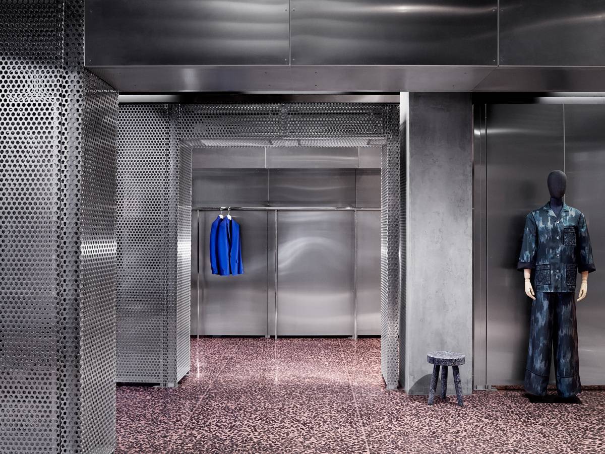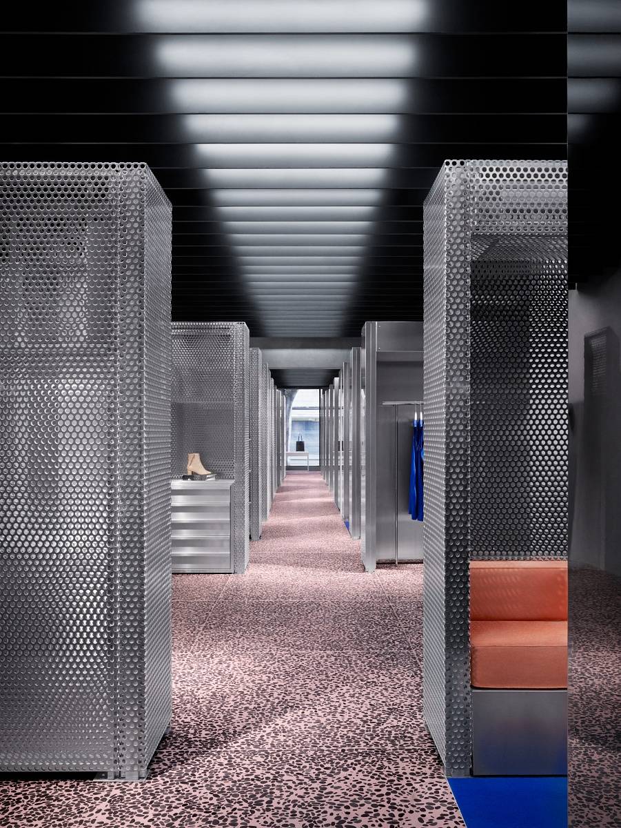 The chic new digs feature pink terrazzo flooring and contrasting clear blue carpets, perforated aluminium structures and Acne Studios designed furniture.