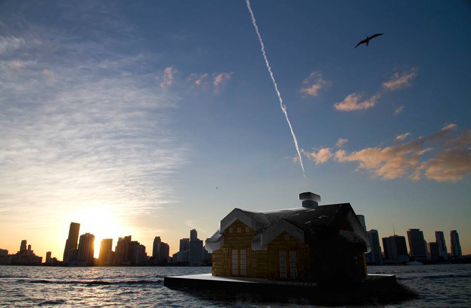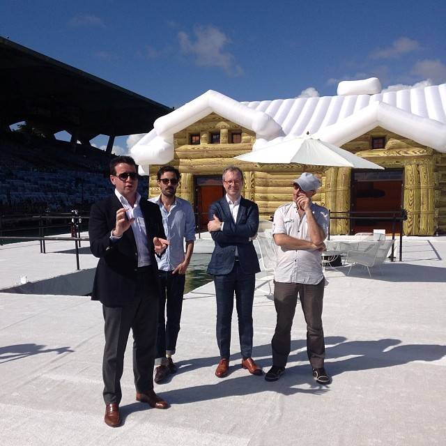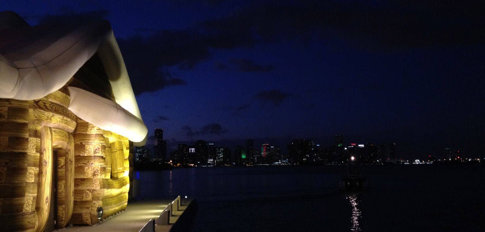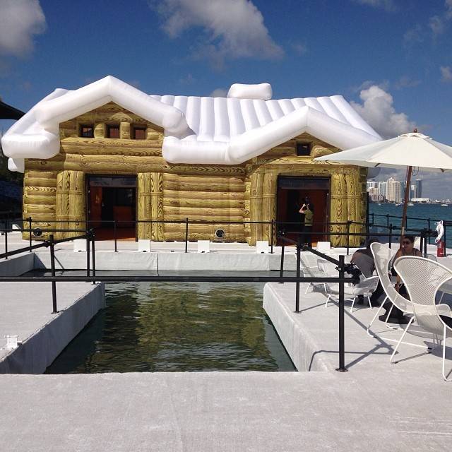 “We have taken this idea of an invader exploring a foreign land and applied it to the snow covered chalet that has set off on a journey and arrived in the middle of a maritime stadium in the hot Florida sun,” the duo said. “We are interested in looking at the chalet in its most essential form and seeing this form as a hut, or as a symbol of the beginnings of the American colonial habitat. If we look at the chalet as a representation of American colonial architecture, the artwork provides a stark contrast to the golden era of leisure in the 1970s and the elegant marine stadium of Hilario Candela. As the symbolic representation of the past, and as a bold and curious foreign explorer of the Miami landscape, the chalet has met upon the once grand stadium. There is a moment for reflection and they seem to be saying to each other ‘Look at what I’ve become’.”