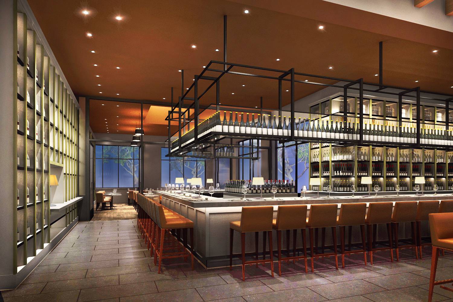 The 12,000 square-foot space will accommodate up to 330 guests both indoors and outdoors. Patrons can choose to sit in the comfortable wood and iron-decorated lounge or in one of three dining rooms: the Wine Room, the White Room and the Orchard Room. With two skylights and five floor-to-ceiling windows with a view of an olive tree forest, the Wine Room beams with natural light. The space can accommodate up to 40 people around wood tables with leather dining chairs. The 48-foot illuminated wine display shows off the large selection of French, Italian, Spanish, and Californian wines. Café curtains and wood flooring complete the room.