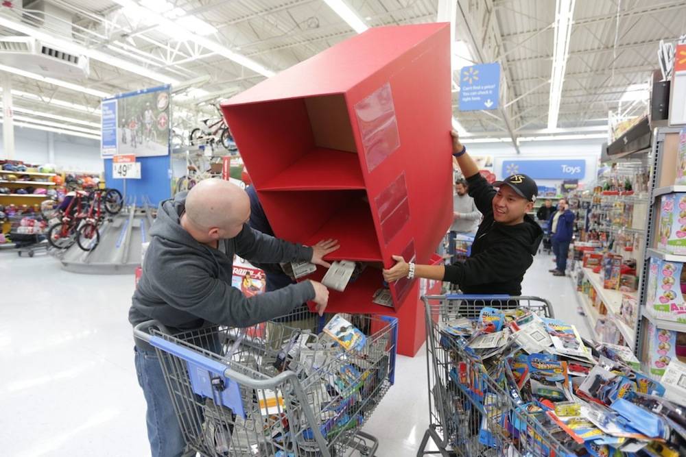 At 10 a.m. this morning, more than 200 staff filled the aisles of Wal-Mart to fill carts with something for every kid. Staff made multiple trips between the toy department and checkout with carts piled high. In addition to toys, every single bike available in Wal-Mart, 250 total, was purchased for the drive. Following the shopping spree, store shelves were left empty as the staff posed for a photo with the carts spelling out XS in the parking lot.