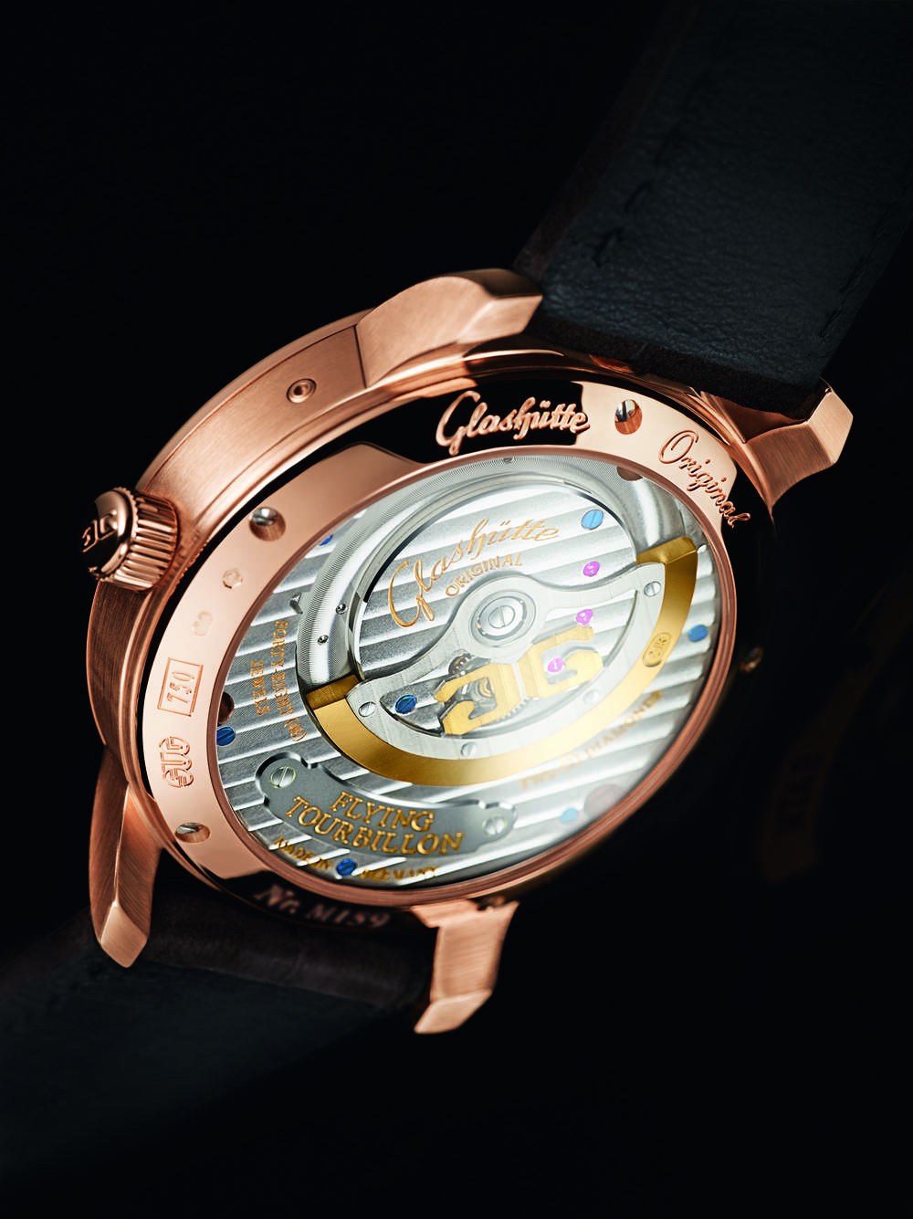 One of the great signatures of this brand, across the range of its collections, is the large Panorama Date window (it’s always the 25th in press photos). In this case it is exactly half the size of the tourbillon carriage. Another signature element is the asymmetric design, with hour and minute dial positioned to the left of center. In this case, it is overlapped by the tourbillon window and, despite the relatively small (40mm) dial, adjacent to another complication, a fully integrated moon phase mechanism, with an indicator, at the 2 o’clock position. Despite all these functions, the dial remains classic and uncluttered. The placement of the dials, says Glashütte Original, has been determined in accordance with the “divine proportion,” otherwise known as the “golden ratio,” the legendary law of aesthetic harmony (in mathematics, two quantities are in the golden ratio if their ratio is the same as the ratio of their sum to the larger of the two quantities – an example is the proportion of the date window to the tourbillon window).