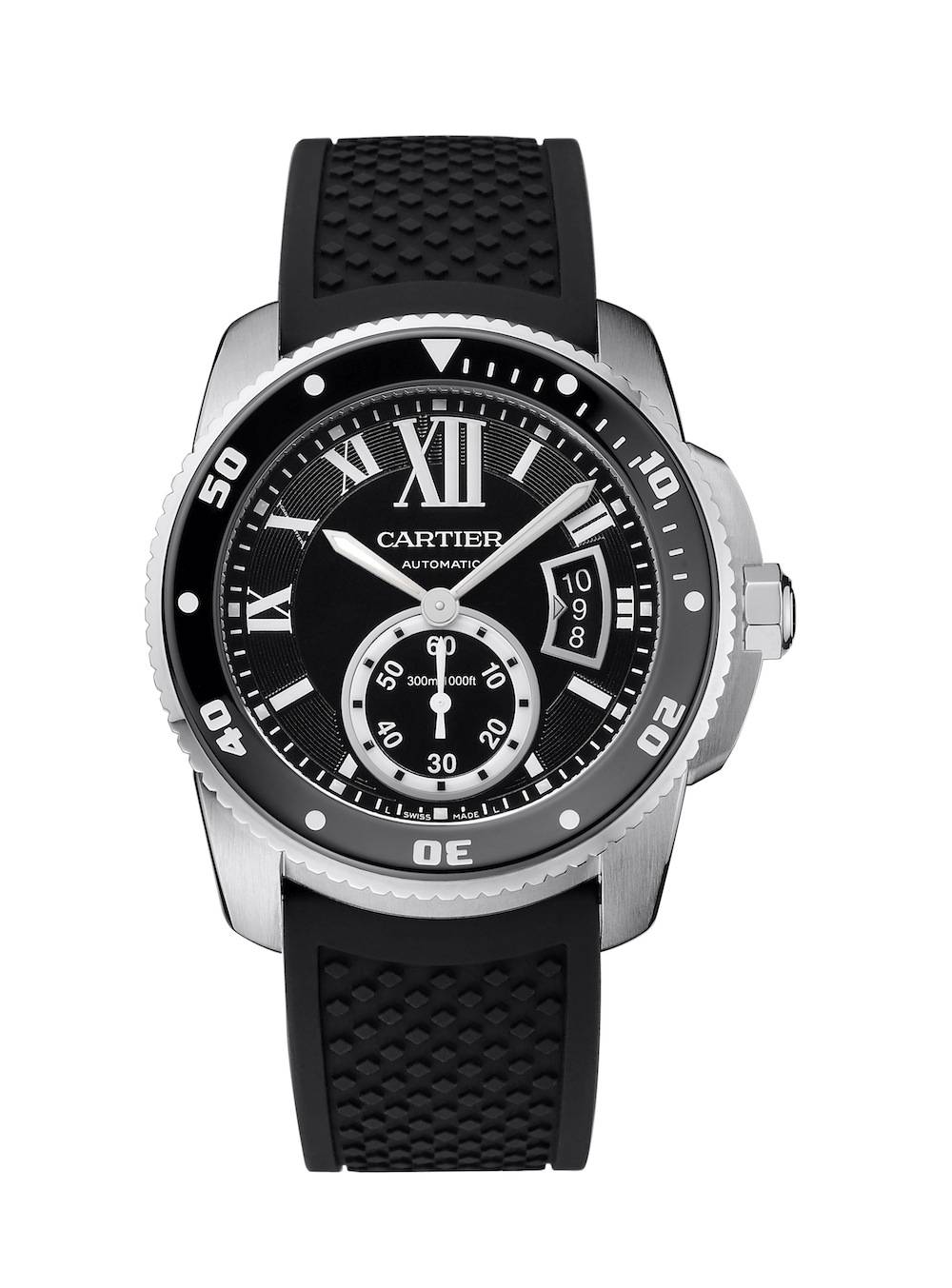 I had a sneak peek of this watch when I was at the Cartier manufacture in La Chaux-de-Fonds in early December, and thrilled to see the brand’s very first diver’s watch. Aesthetically, the Calibre seems tailor-made to serve as a sports watch (or “tool” watch), with its wide lugs and crown protector, while retaining the brand’s signature look: Roman numerals and railroad chapter ring. With an oversized numeral at 12 o’clock, as well as a small seconds at 6 o’clock and a date window at 3 o’clock, the watch still looks uncluttered, even on a relatively small 25.6mm dial.
