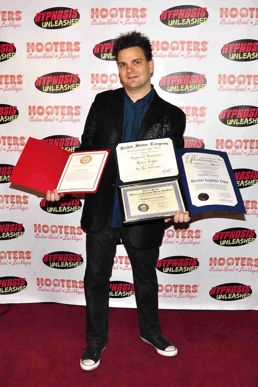 Hypnosis Unleashed starring Kevin Lepine celebrated its one-year anniversary on Tuesday at the Night Owl Showroom at Hooters. Dane Marrow, casino ambassador at Hooters, presented Lepine with a cake and proclamation from Mayor Carolyn G. Goodman recognizing “Kevin Lepine Day.” He was also recognized with certificates from Sen. Dean Heller, Rep. Joe Heck and Gov. Brian Sandoval.