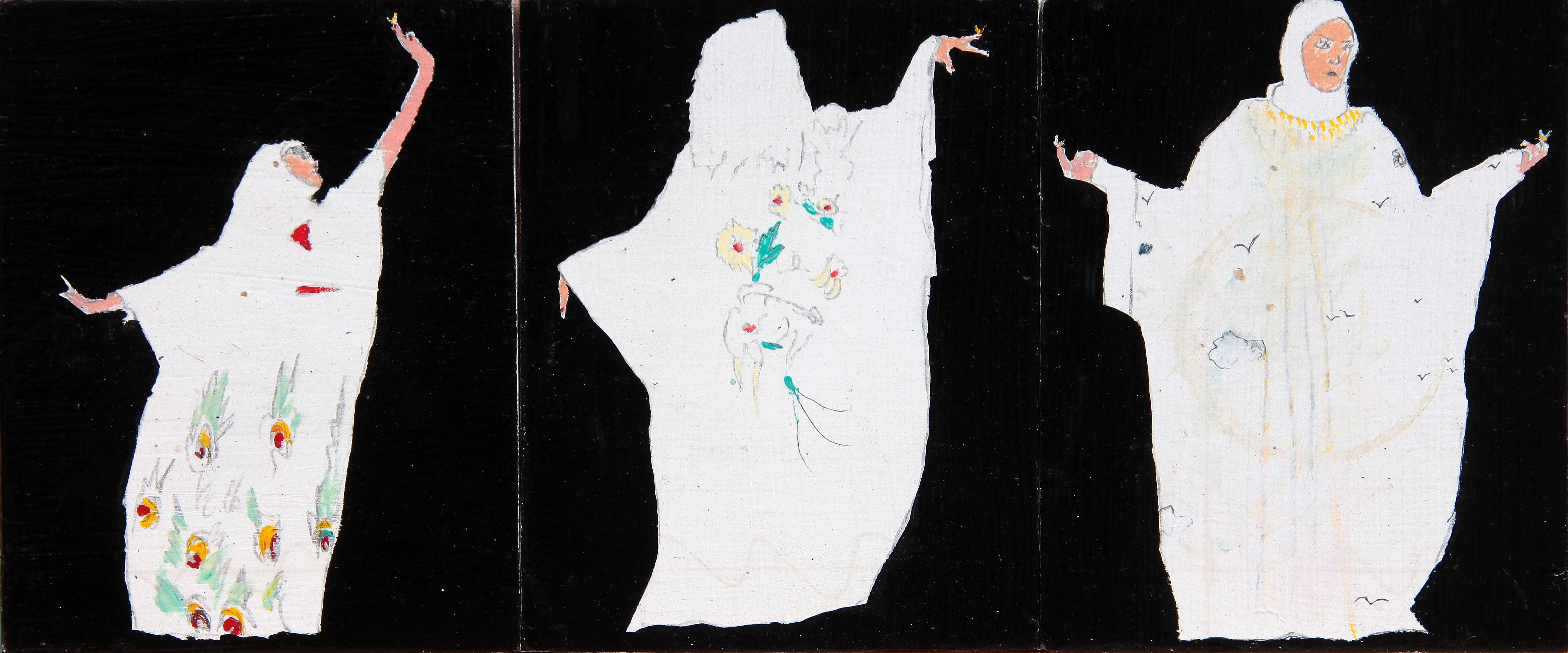 The sense of isolation that permeates much of Gent’s work virtually evaporates in Girls with Butterflies, a central work within this new series. Clad in the abaya and gracefully twirling over the painting, Gent’s “Girls” are lost within themselves as they dance with butterflies in scenes reminiscent of a Disneyesque innocence in the first stages of blossom. Irrepressibly alive, Gent’s minimalistic brushstrokes evoke the grace and fluidity he so admires in women. While consumed within their own worlds, Gent’s “Girls” are simultaneously isolated yet ethereal and empowered.