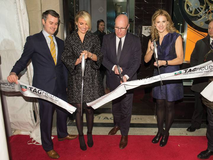 Tag Heuer opened its first flagship boutique in New York City on Jan. 28, and to celebrate, actress and brand ambassador, Cameron Diaz, joined TAG Heuer Global CEO and President, Stephane Linder, for the official ribbon-cutting ceremony. In honor of the grand opening on Fifth Avenue, the brand hosted a cocktail party at the nearby Museum of Modern Art featuring contortionist dancers and music by DJ Eve. In keeping with TAG Heuer’s global theme for 2014, “The Art of Manufacturing,” expert mixologists were on hand to “scientifically engineer” cocktails.