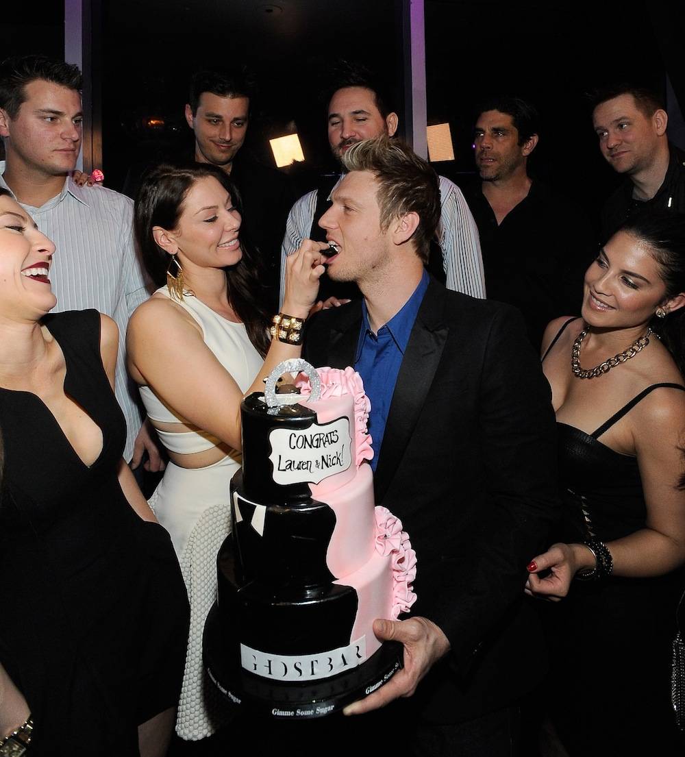 The Backstreet Boy also briefly mentioned that he’s been filming an upcoming reality TV show with VH1 that documents their entire wedding experience. Once inside the club, Ghostbar’s cocktail waitresses came out with oversized scorecards that spelled out “Lauren” and “Nick” and presented the bachelor and bachelorette with a congratulatory three-tier pink and black cake that sported a blinged out diamond-ring topper. Confidingly, Kitt’s group of girlfriends humorously placed plastic light-up diamond rings on their fingers while Beyonce’s “Single Ladies (Put A Ring On it)” played over the sound system.