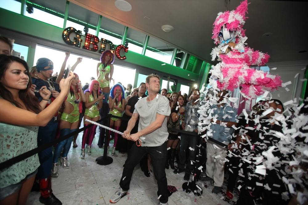 Carter and his friends spent the afternoon at Ghostbar Dayclub, the wild, over-the-top daytime bash, on Saturday. Arriving at a warm welcome from hundreds of screaming fans, the Backstreet Boy, quickly threw on a pair of neon green sunglasses while posing for photos with high-energy partygoers before being blindfolded in the center of the room for an old-fashioned game of piñata. The crowd erupted as a few strokes into the game, Carter sprayed the hot spot with confetti as he smashed open the pink-and-white donkey shaped piñata. Carter and his friends returned to their VIP booth where the jolly singer sported the top of the piñata on top of his head. Carter was all smiles when he spotted two cocktail servers wearing unicorn heads and capes, asking them to come over and take a photo with him.