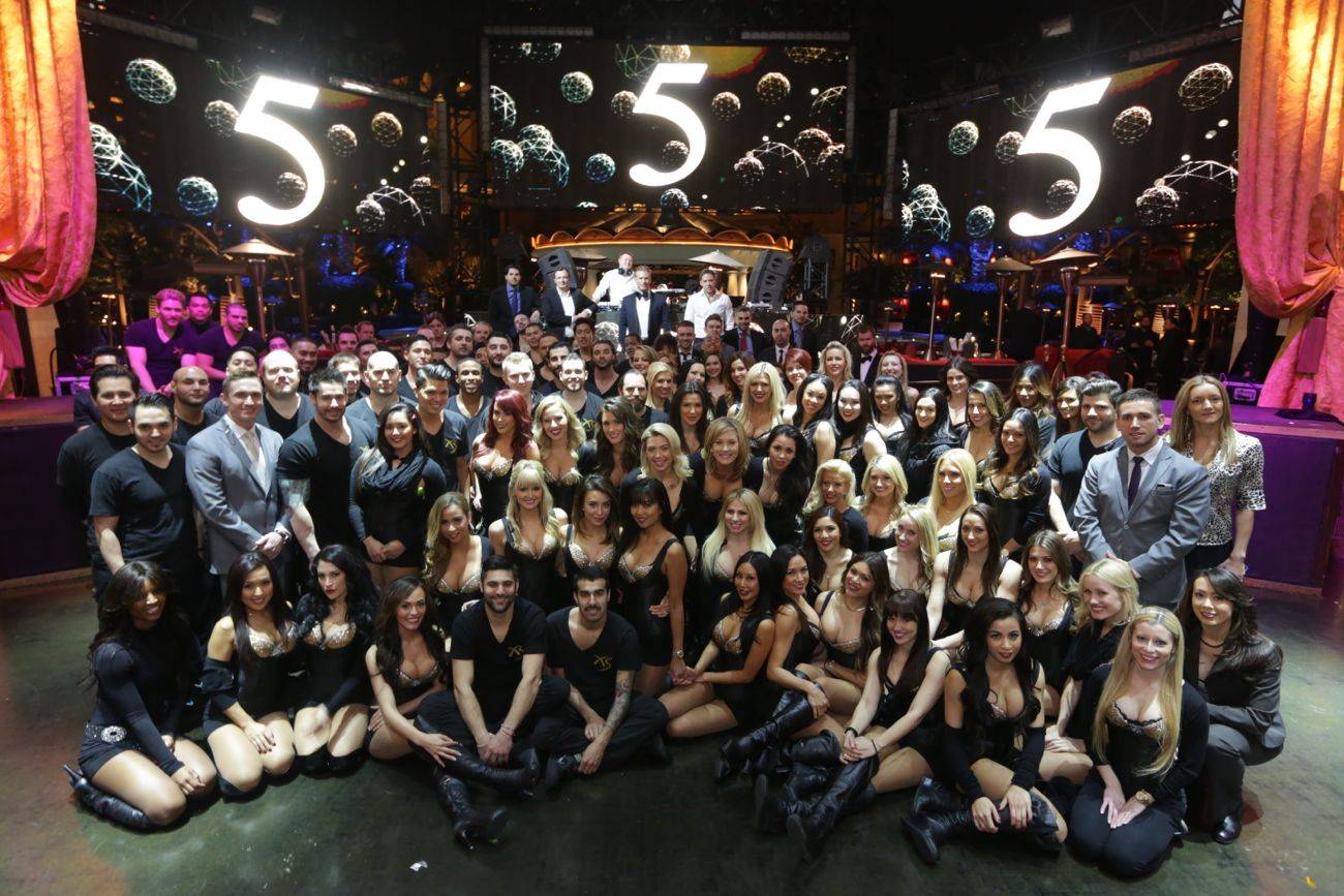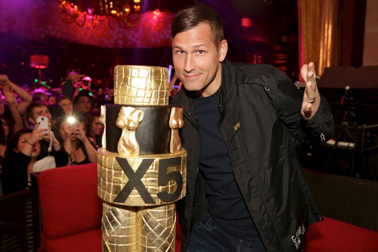 Kaskade also took time to pose with the five executives who have been involved in the award-winning venue since its doors opened. Surrounding a cake made with embellishments inspired by the iconic club itself, the team was all smiles as they raised a glass to the achievement. In the picture, from left to right, John Wood, senior executive director of VIP services; Ronn Nicolli, executive director of nightlife marketing; Jesse Waits, managing partner; Kaskade; Yannick Mugnier, executive director of nightlife operations; and Eric White, assistant general manager. The enormous creation by bakery Gimme Some Sugar was highlighted by features found inside XS including gold torso sculptures that can be spotted behind the bars and the gold pillars throughout.