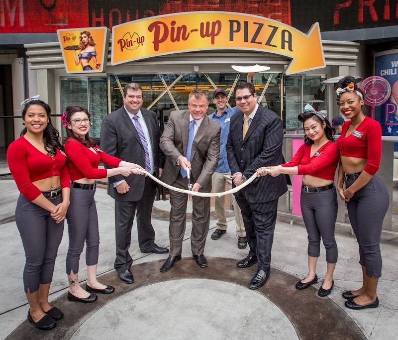 Sin City’s newest pizza eatery, Pin-Up Pizza, celebrated its grand opening with a pizza dough ribbon cutting, world-champion dough flair, high-flying pizza tossing and Pin-Up Pizza girls. Present for the dough cutting was president of Planet Hollywood Resort David Hoenemeyer, vice president of food and beverage Jeffrey Frederick and director of food and beverage Terrence O’Donnell.