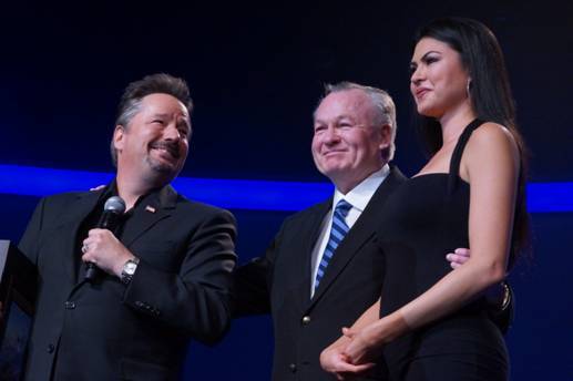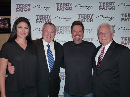 Brigadier General Charles Jones, U.S. Air Force, Retired and Major General Paul Vallely, U.S. Army, Retired, surprised headliner Terry Fator and his wife Taylor Makakoa on stage during his show at the Mirage with a “Great Appreciation” plaque. The plaque was given to them in honor of all their years of support and acknowledgment they have given to military charities, military members and their families.