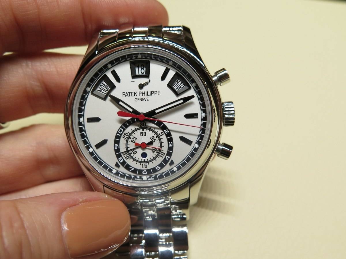The Patek Philippe Annual Calendar Chronograph, Ref. 5960 was originally introduced in 2006 in a platinum case.  Outside the Nautilus and Aquanaut collections, there are few steel Patek Philippe watches. The movement, automatic Caliber CH 28-520 IRM QA 24H, is unchanged, as is the case (except that it is now stainless steel), but the dial has been refurbished and the bracelet, also steel, is new for the brand. The first day of the month is displayed in red and the rest in black. There is also a power reserve indicator and day/night indications.